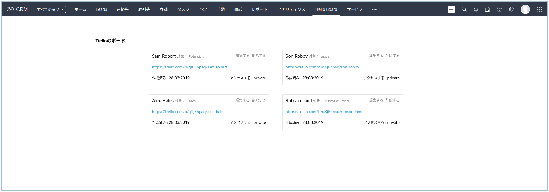 同様に、カスタムタブである[Trello Boards]をクリックすることもできます。Zoho CRMの各タブで作成されたボードが表示されます。