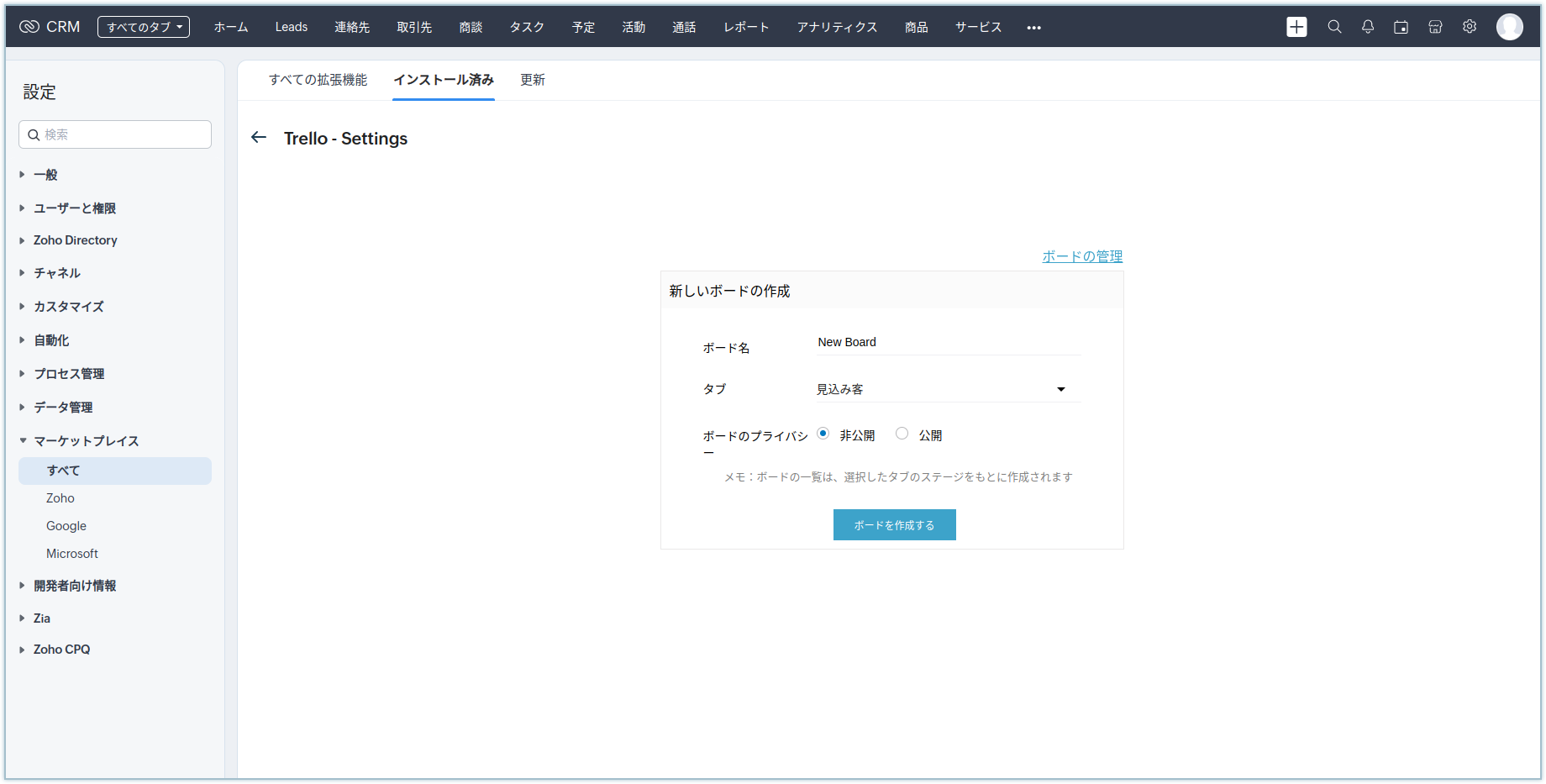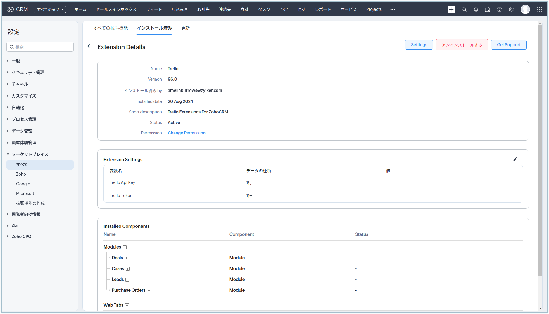 1. Zoho CRMで、[設定][マーケットプレイス][Installed](インストール済み)の順に移動します。