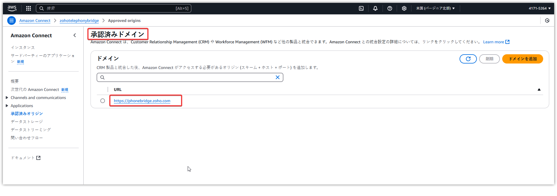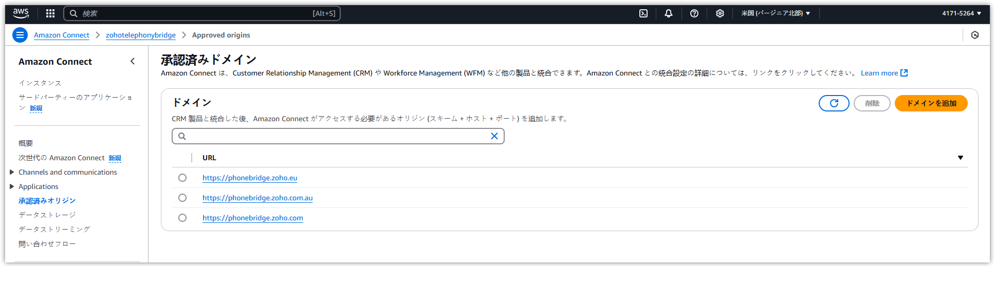 Zoho CRMドメインをホワイトリストに登録した後、Zoho CRMアカウントにAmazon Connectを設定します。