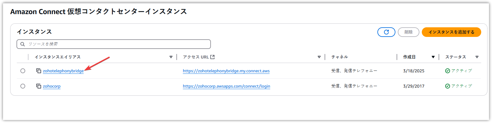 - AmazonコンソールでZoho CRM用に作成した インスタンスエイリアス 名を入力します。