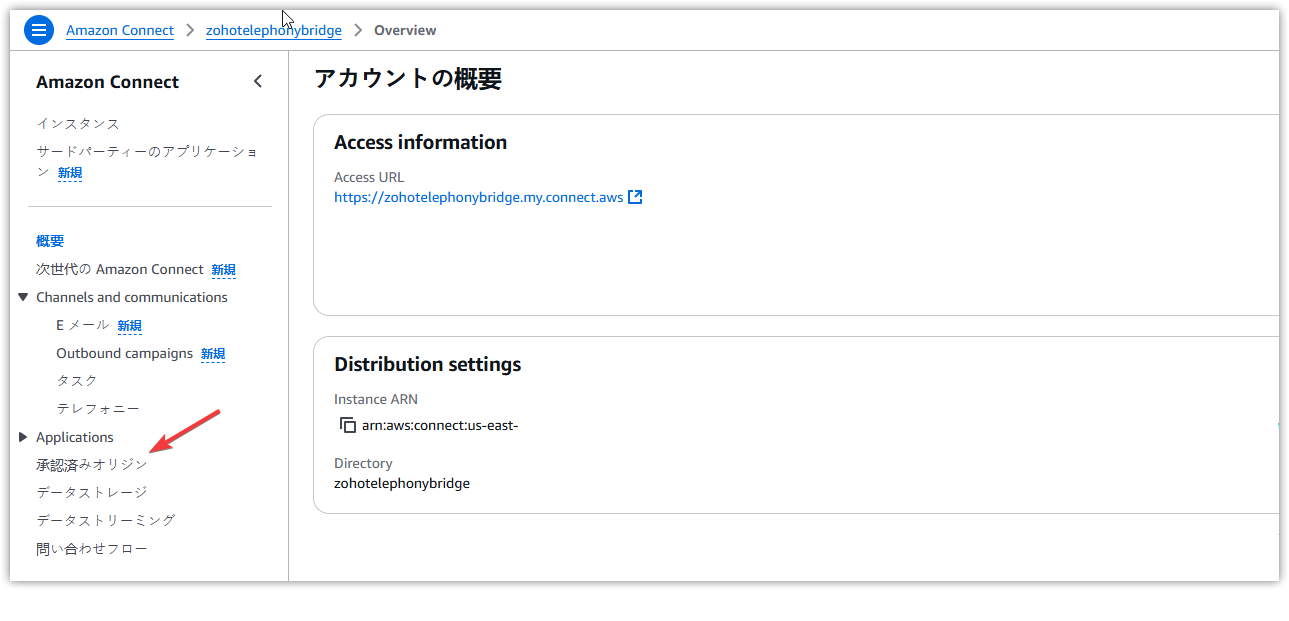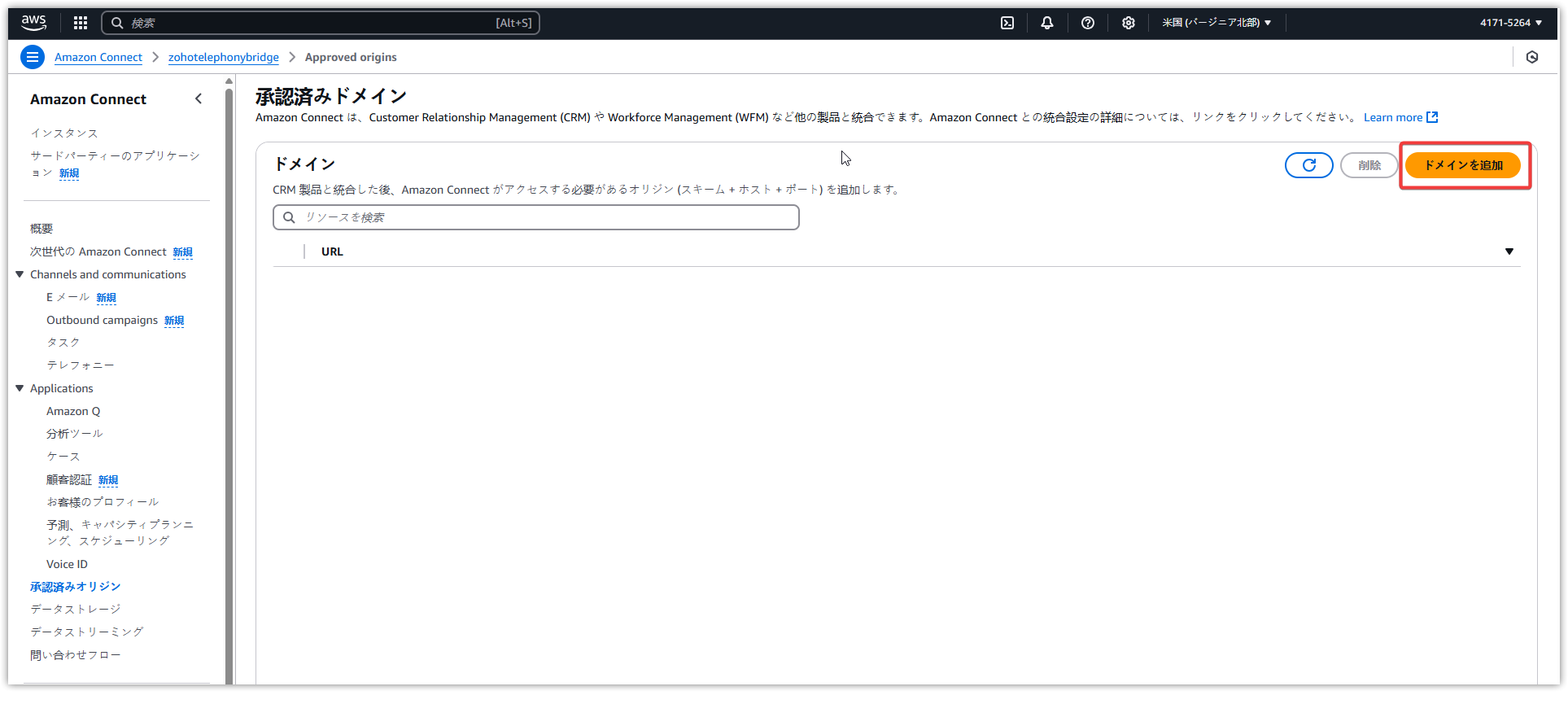 この連携を開始する前に、Amazon Connectインスタンスにアクセスするために、Zoho CRMドメインをホワイトリストに登録してあることをご確認ください。次の手順を実行します: