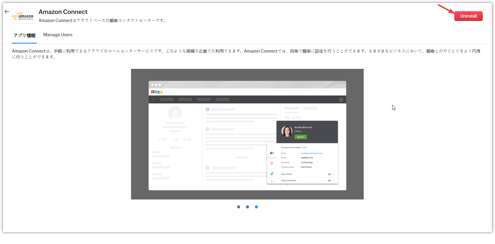 Amazon Connect連携はいつでも無効にできます。Zoho CRMアカウントの管理者のみが、連携を無効にできます。