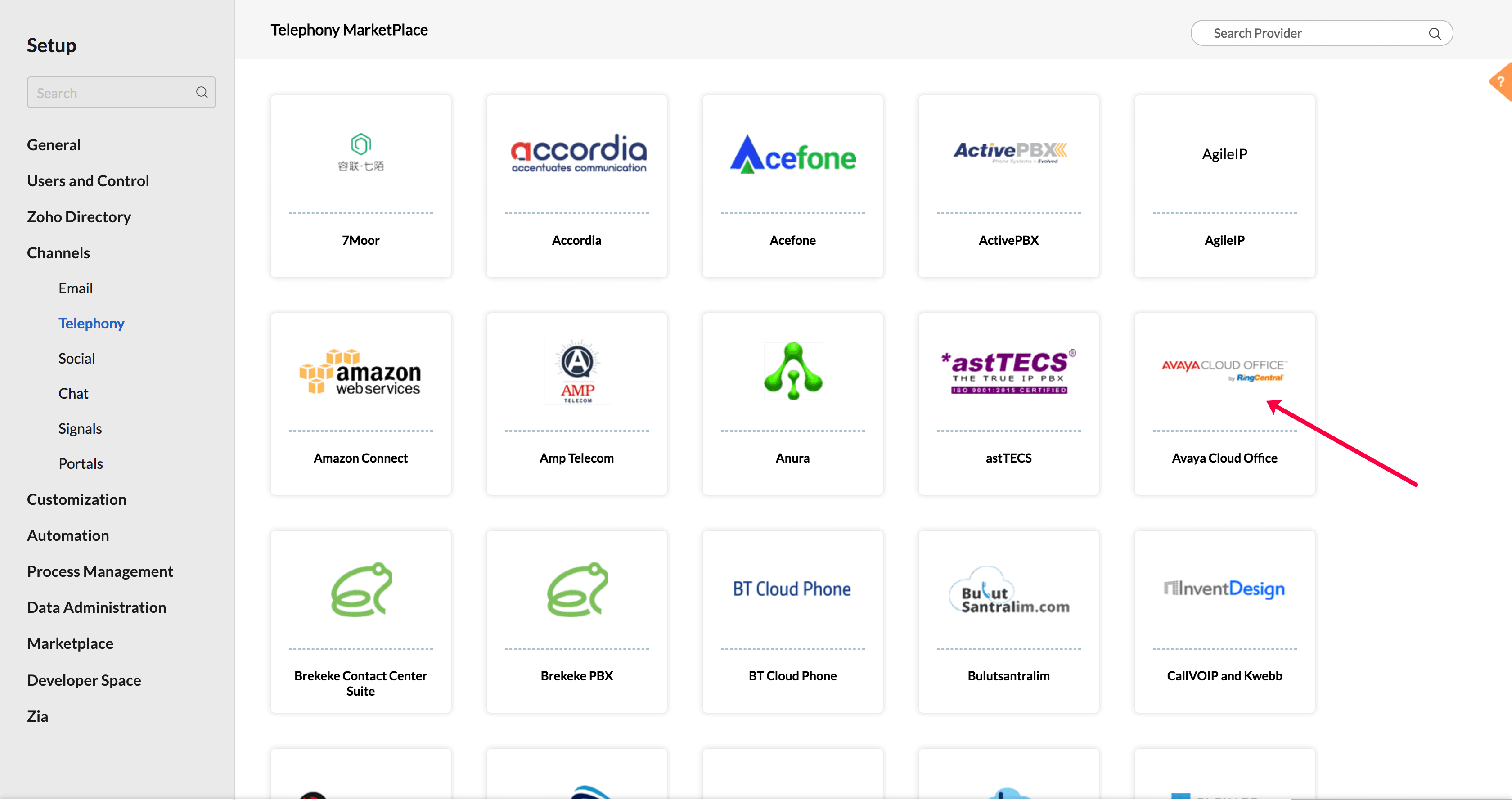 Zoho CRMから連絡先への通話の発信は、Avaya Cloud Officeを通じて行われます。