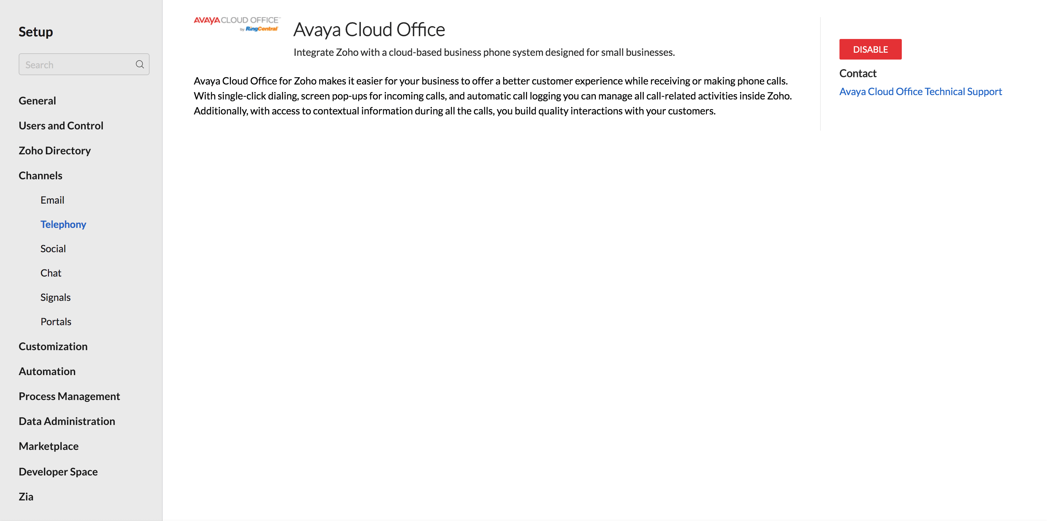 必要に応じていつでもAvaya Cloud Office連携を無効にできます。連携を無効にできるのは、電話連携を管理するZoho CRMアカウントの管理者のみです。