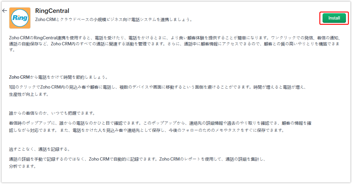 - Zoho CRMアカウントの管理者のみが、RingCentral連携を有効にできます。