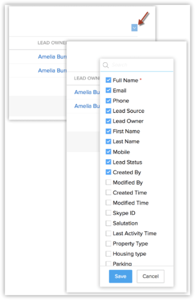 - セクションの列をカスタマイズするには、セクションの右側にあるドロップダウンの矢印をクリックします。