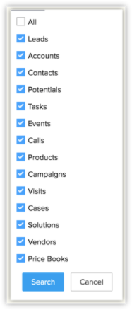 - 全体検索の際、CRM内で検索するタブを選択して、検索結果をフィルタリングすることができます。