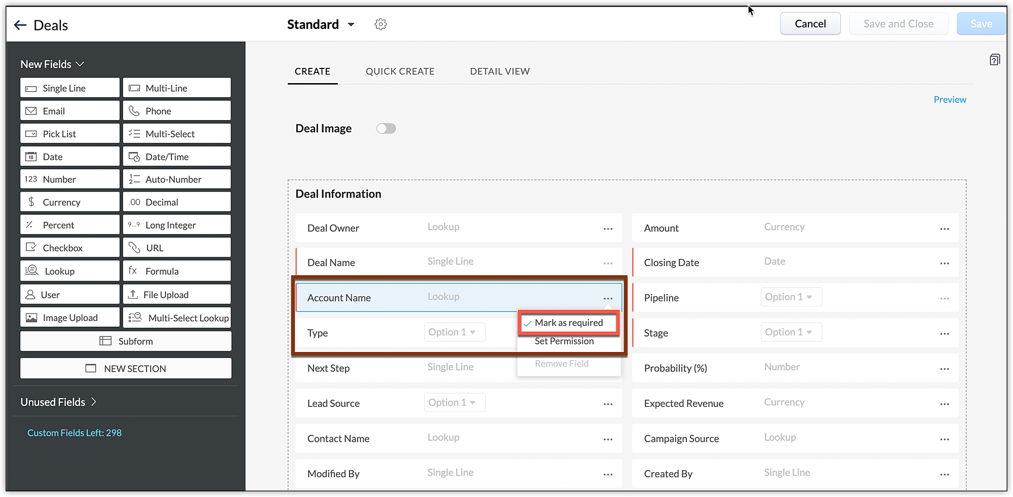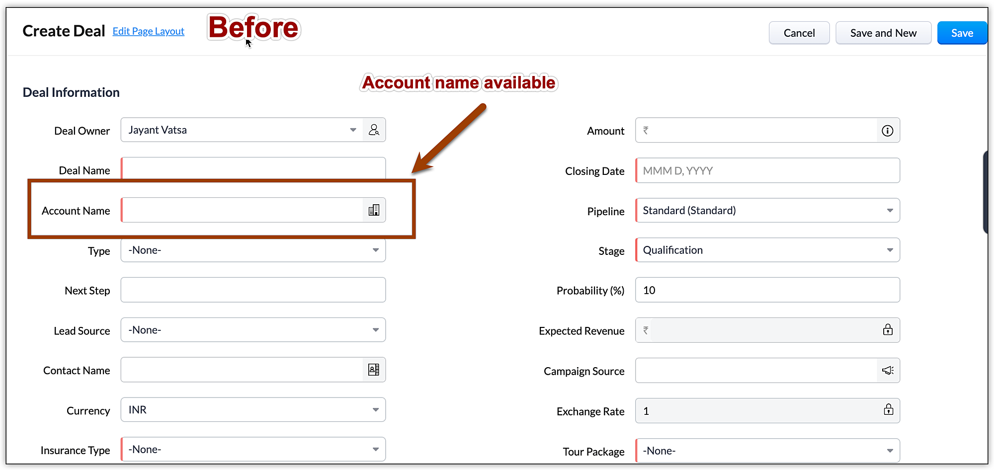 組織が他の企業や個人顧客(B2BとB2Cの両方)と取引している場合、取引先タブを無効にしてしまうと上手くいきません。この場合、見込み客タブと商談タブの両方で、会社名/取引先名の項目を必須ではなくする必要があります。そうすることで、会社名/取引先名の項目を入力せずにデータの見込み客や商談の保存ができます。