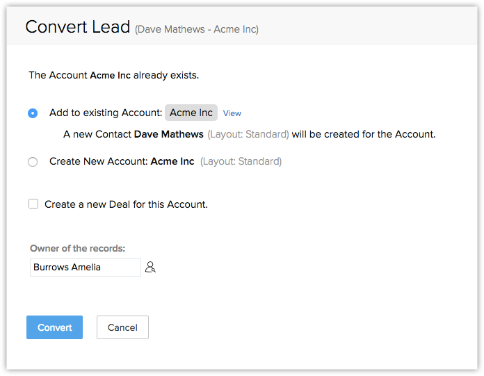 これにより、Zoho CRMアカウントに新しい見込み客データが作成されます。