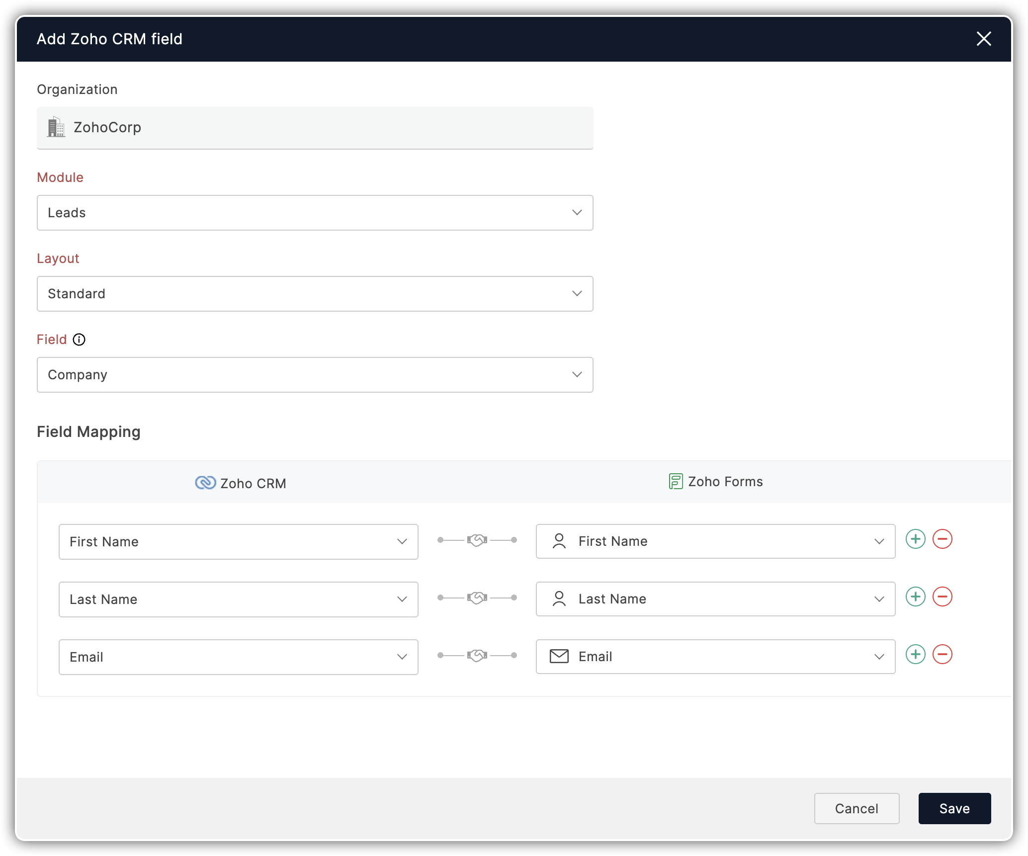 項目の関連付け:Zoho CRMの項目をZoho Formsのフォームの項目と関連付けることができます。たとえば、Zoho Formsで作成したフォームに会社名の項目を追加したとします。