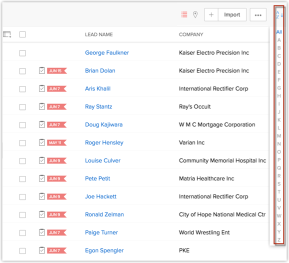 Zoho CRMのタブ内に大量のデータがある場合、特定のデータを見つけ出すのに、一覧をすべて確認するのでは時間がかかってしまいます。データの検索機能を使用すると、手間をかけずに、対象のデータをすばやく見つけられます (関連情報:データの検索)。