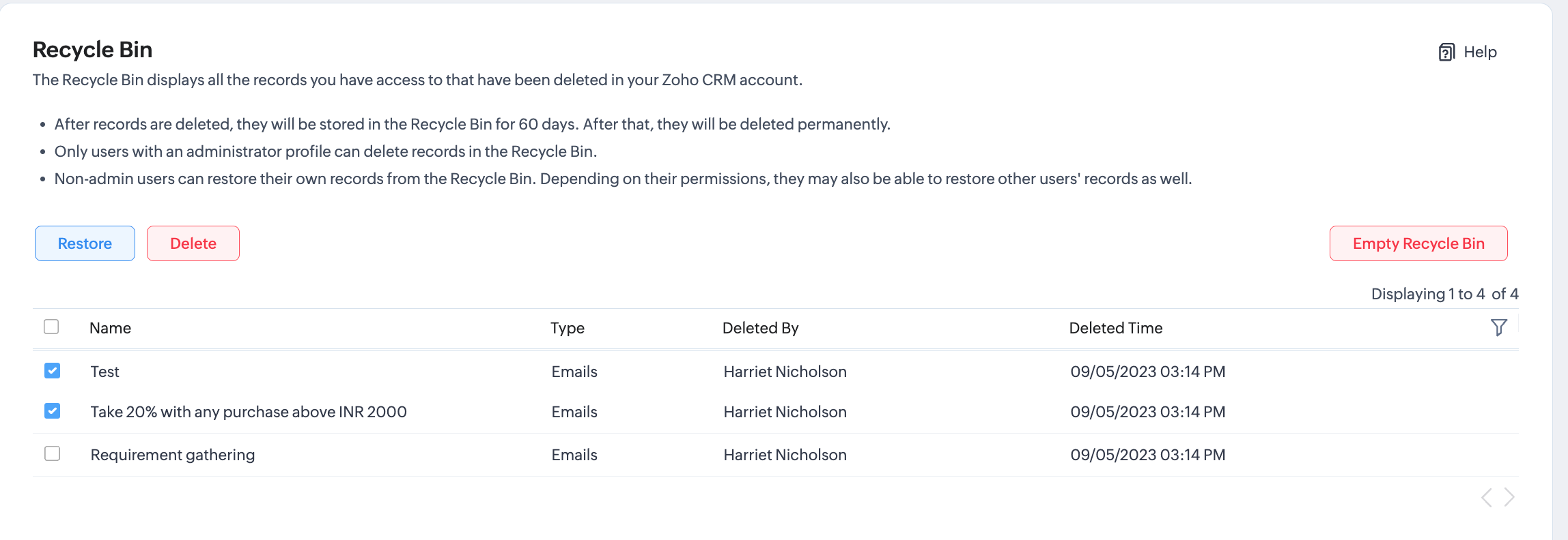 Zoho CRMアカウントから削除されたデータやファイルは、一時的にごみ箱に保存されます。60日以内であればごみ箱のデータを復元できますが、60日を過ぎるとZoho CRMアカウントから完全に削除されます。なお、60日を過ぎる前でも、ごみ箱からデータを手動で削除することも可能です。