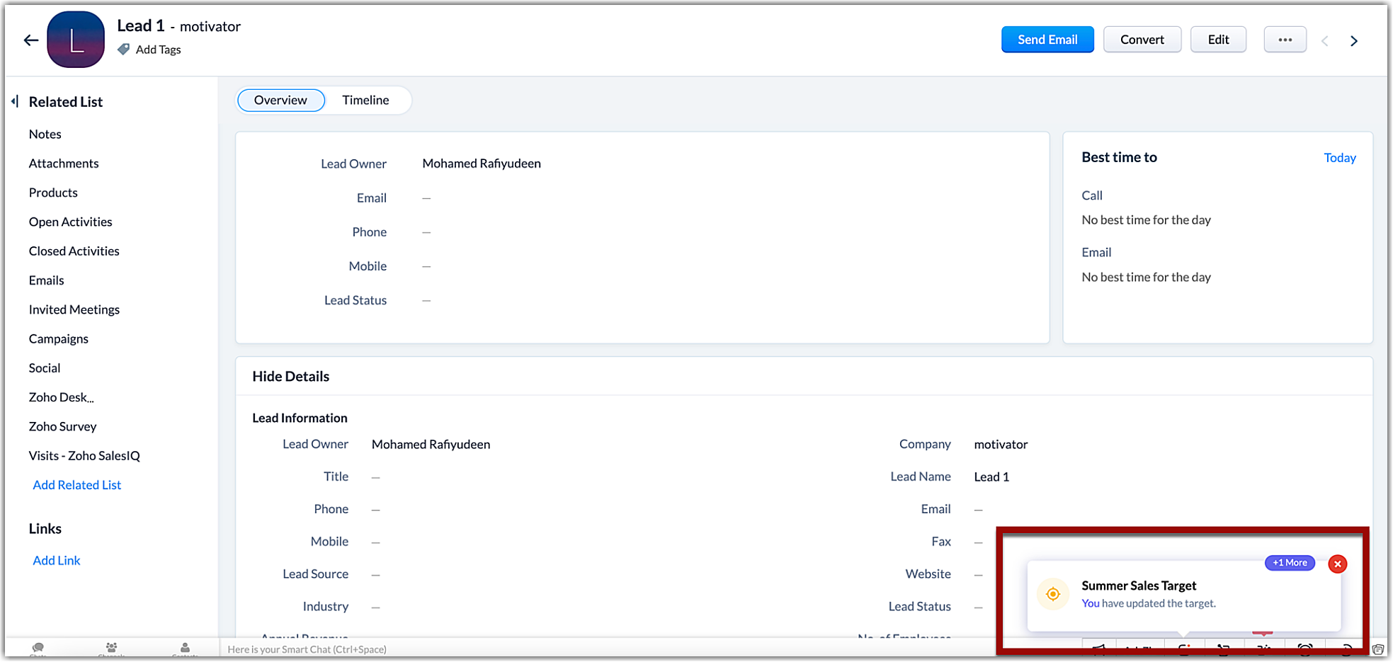 通知は、モチベーター機能を利用している間だけでなく、Zoho CRM内で他の機能を利用している間も確認できます。