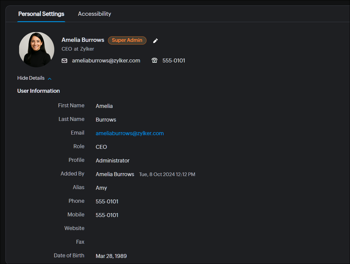 ユーザーの名前、電話番号、Webサイト、誕生日、住所、言語、時刻形式、タイムゾーンなどの個人設定を変更できます。