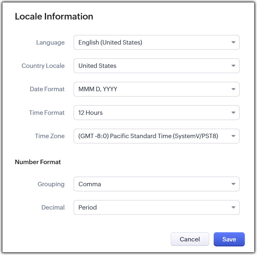 地域の設定内容に基づき、CRMアカウントの言語を設定できます。また、CRMアカウントの時刻形式を、12時間形式または24時間形式のいずれかを選択することが可能です。日付形式は、選択した地域に応じて設定されます。次の国際標準の日付形式に対応しています。