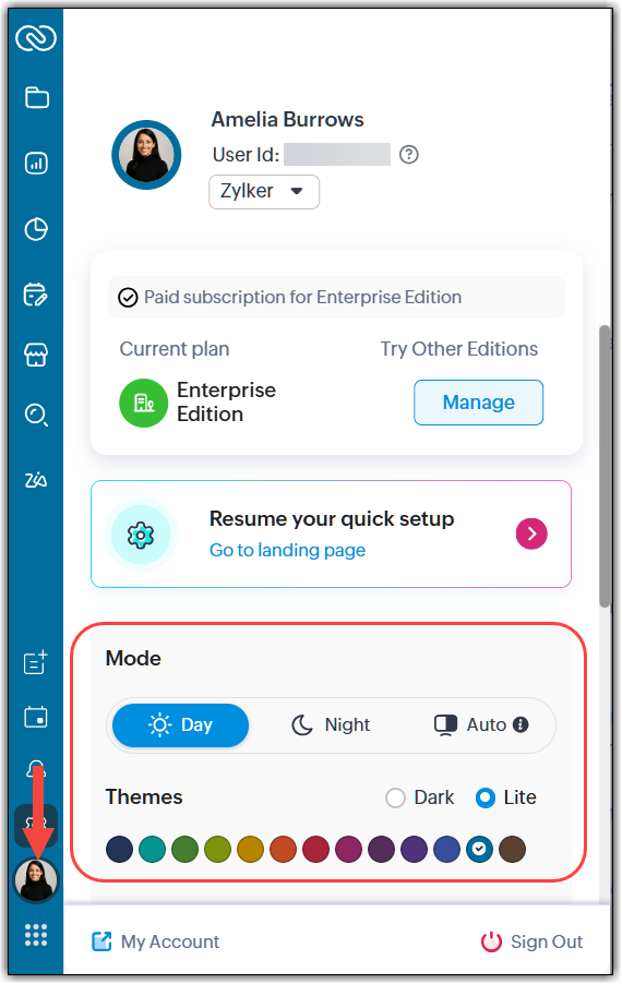 テーマとモード(昼間/夜間/自動)を選択して、Zoho CRMのアカウントの外観をでカスタマイズできます。こちらの設定はユーザーごとに適用されます。そのため、あるユーザーが選択したテーマが他のユーザーのZoho CRMアカウントに反映されることはありません。