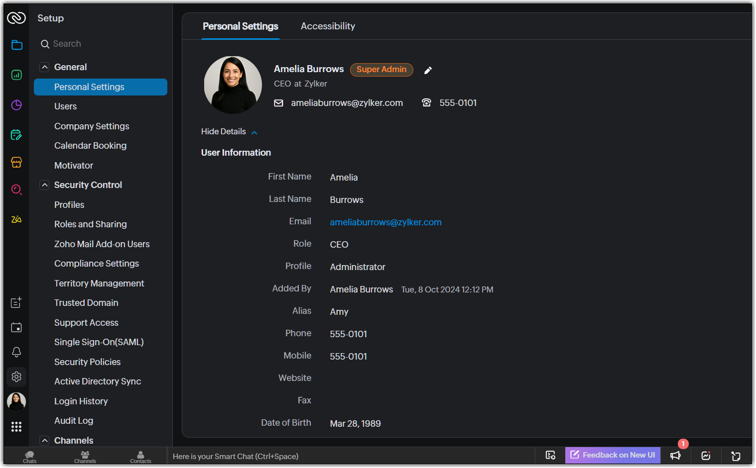 Zoho CRMにユーザー登録してアカウントを作成した後、CRMアカウントの設定内容をカスタマイズできます。初期設定では、ユーザー登録時に入力した情報に応じた設定内容が登録されています。ログイン後、これらの詳細情報を好みに合わせて変更できます。