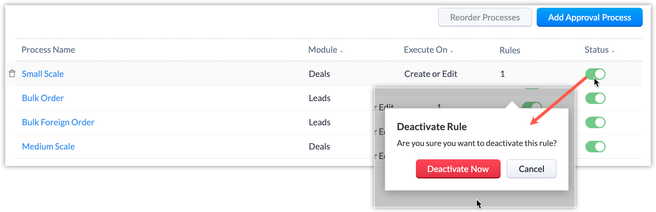 同じタブに複数の承認プロセスが設定されている場合、承認プロセスの優先度は、一覧の表示順に基づきます。初期設定では、承認プロセスは、作成した順に表示されます。また、承認プロセス内の複数のルールにデータが一致する場合、最初に一致するルールが適用されます。そのため、要件に応じて、一覧内で承認プロセスを並べ替える必要があります。また、承認プロセス内の各ルールについても同様に、要件に応じて並べ替える必要があります。