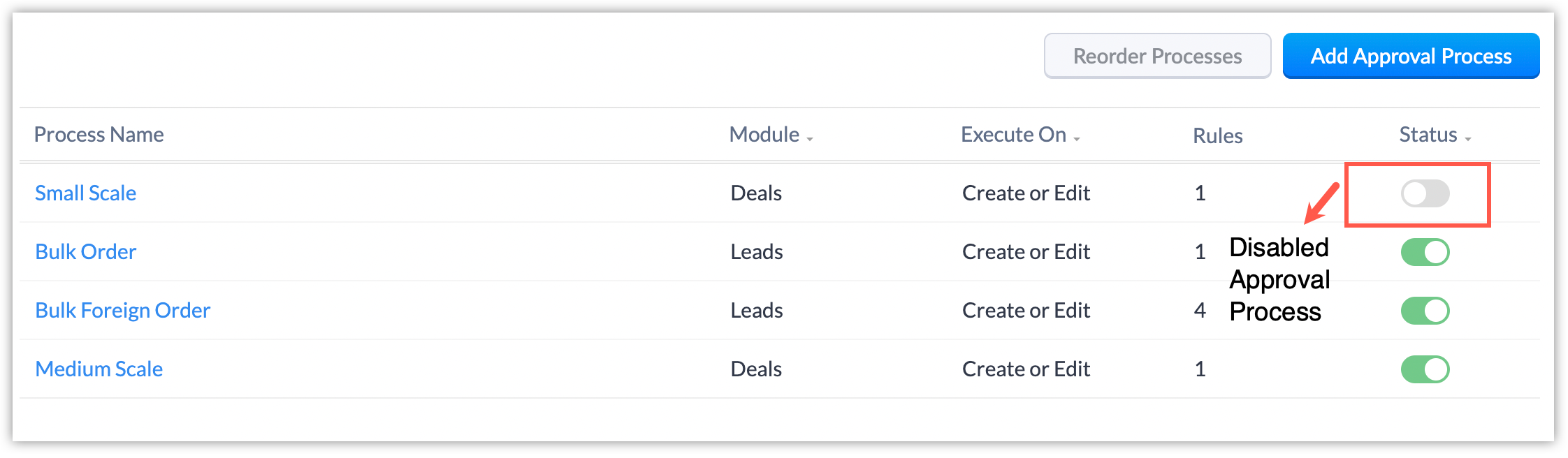たとえば、総額が50万円以上の商談に対して、「総額50万円以上の商談の承認経路」という承認プロセスを作成したとします。また、総額が80万円以上の商談に対して、「総額80万円以上の商談の承認経路」という別の承認プロセスを作成したとします。この場合、2つの承認プロセスは作成した順番で一覧に表示されます。