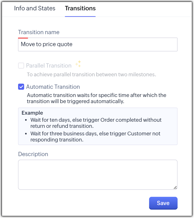 通常は、見積書を作成する際に、要件や詳細情報を把握する必要があります。しかし、初回の連絡時から要件がすでに明確である場合や過去に取引があり確度が高いと見込まれる場合などは、要件確認などの段階(状態)をスキップできます。このような場合に、自動遷移を通じて手間や時間を省くことが可能です。