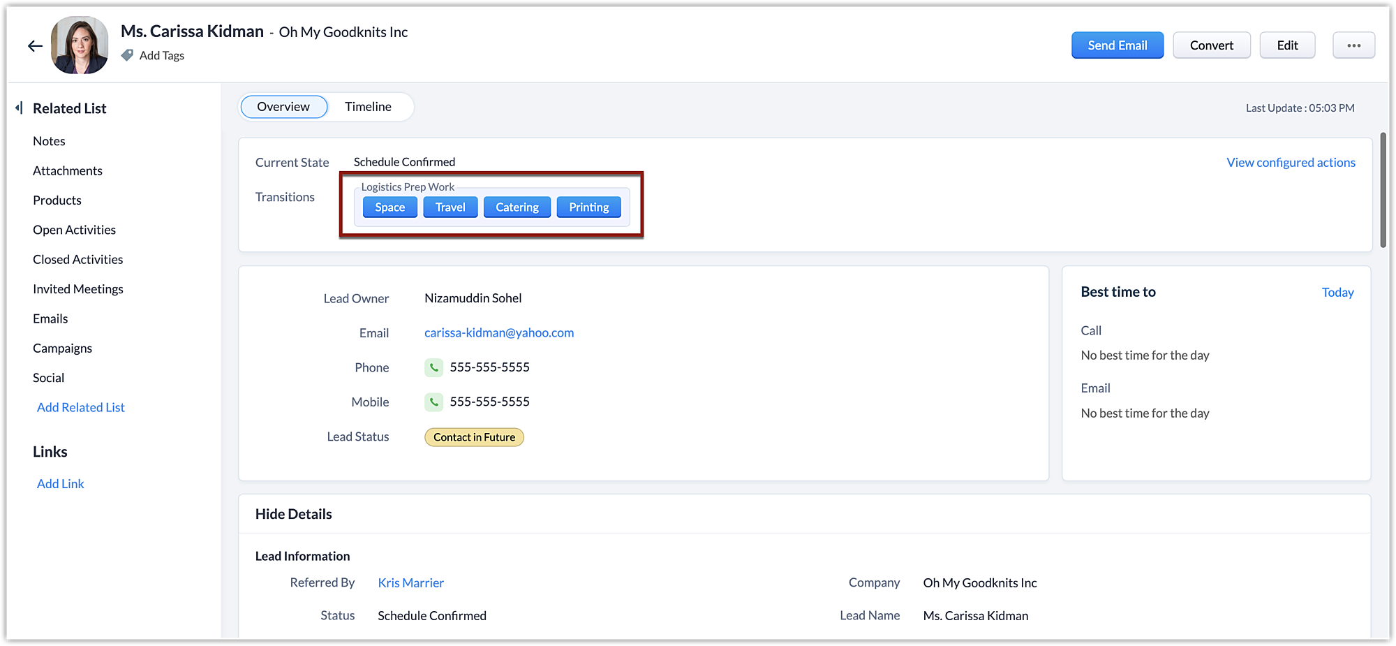 見込み客への連絡を例に説明します。担当者は、メール、電話、チャットの3つの方法で見込み客に連絡するとします。この3つの方法をそれぞれ別々の通常の遷移として作成します。図の例では、担当者はどの方法で見込み客に連絡しても、その方法に対応する遷移を完了すると、状態が、[なし](None)から[連絡済み](Contacted)に変わります(これに対して、並行遷移では、すべての遷移を完了した場合にのみ次の状態に変わります)。このように、いずれか1つの遷移を完了すれば次の状態に遷移(移動)する場合に、この方法が適しています。