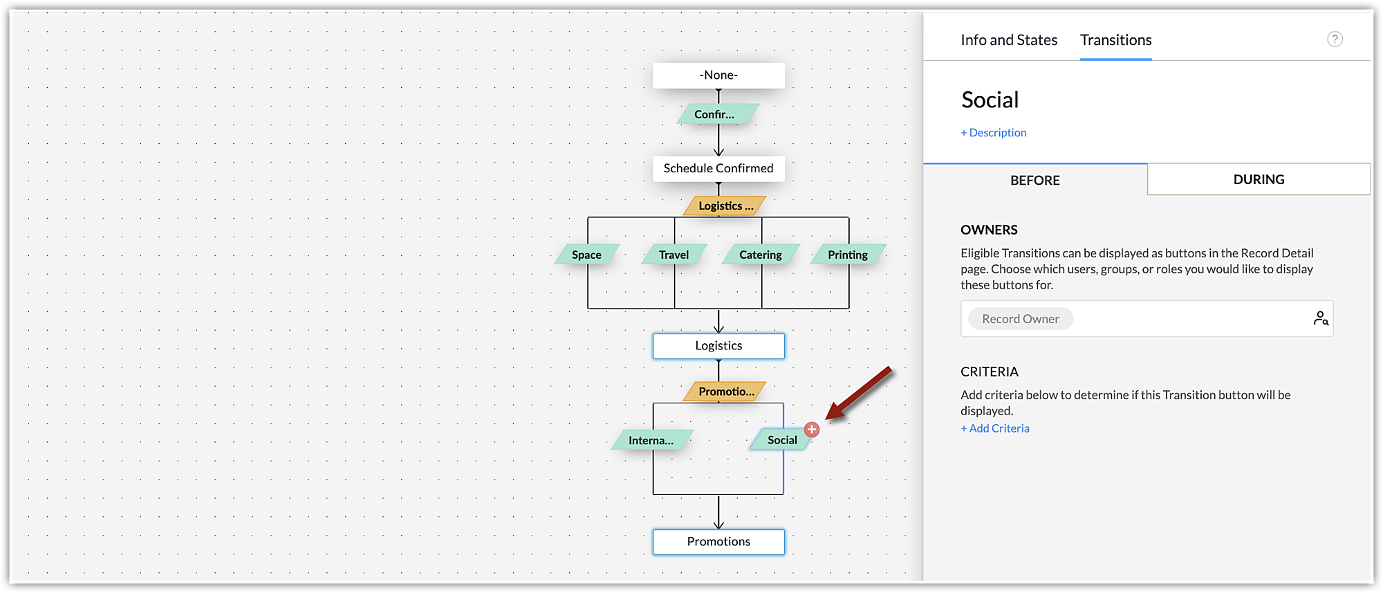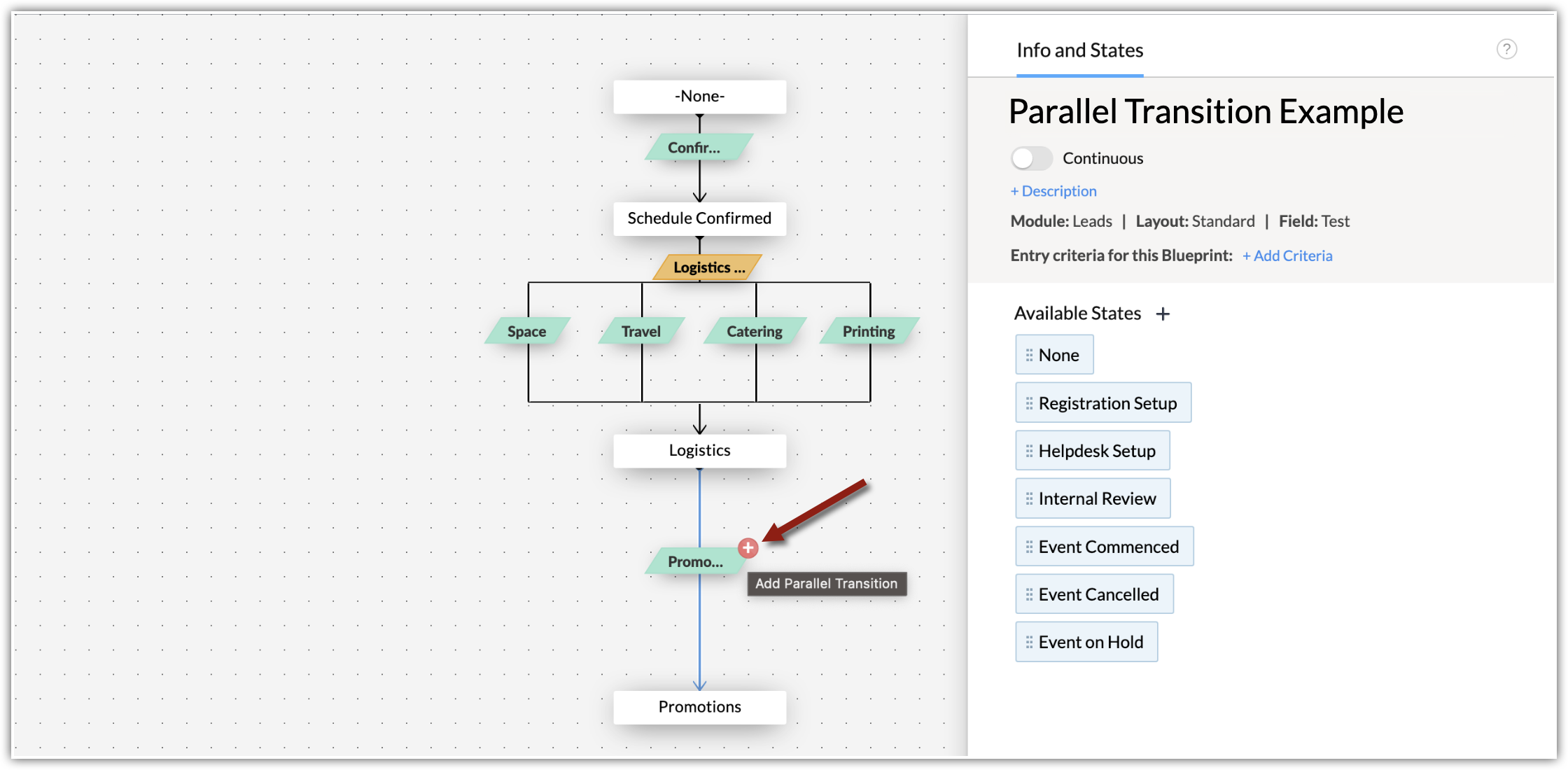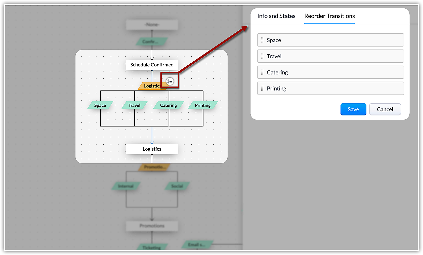 このイベント管理の例では、[事前準備の実施]を、並行遷移におけるメインの遷移名として設定します。そのうえで、[会場の予約]、[ケータリングの手配]、[登壇者の調整]、[配布資料の印刷]という4つの作業項目をサブ遷移として作成します。各サブ遷移は、異なるチーム/個人に割り当てることができます。これにより、必要な作業に同時並行的に取り組むことができます。この例の場合、4つの並行遷移がすべて完了した場合にのみ、[事前準備の実施]というメインの遷移が完了したと見なされます。