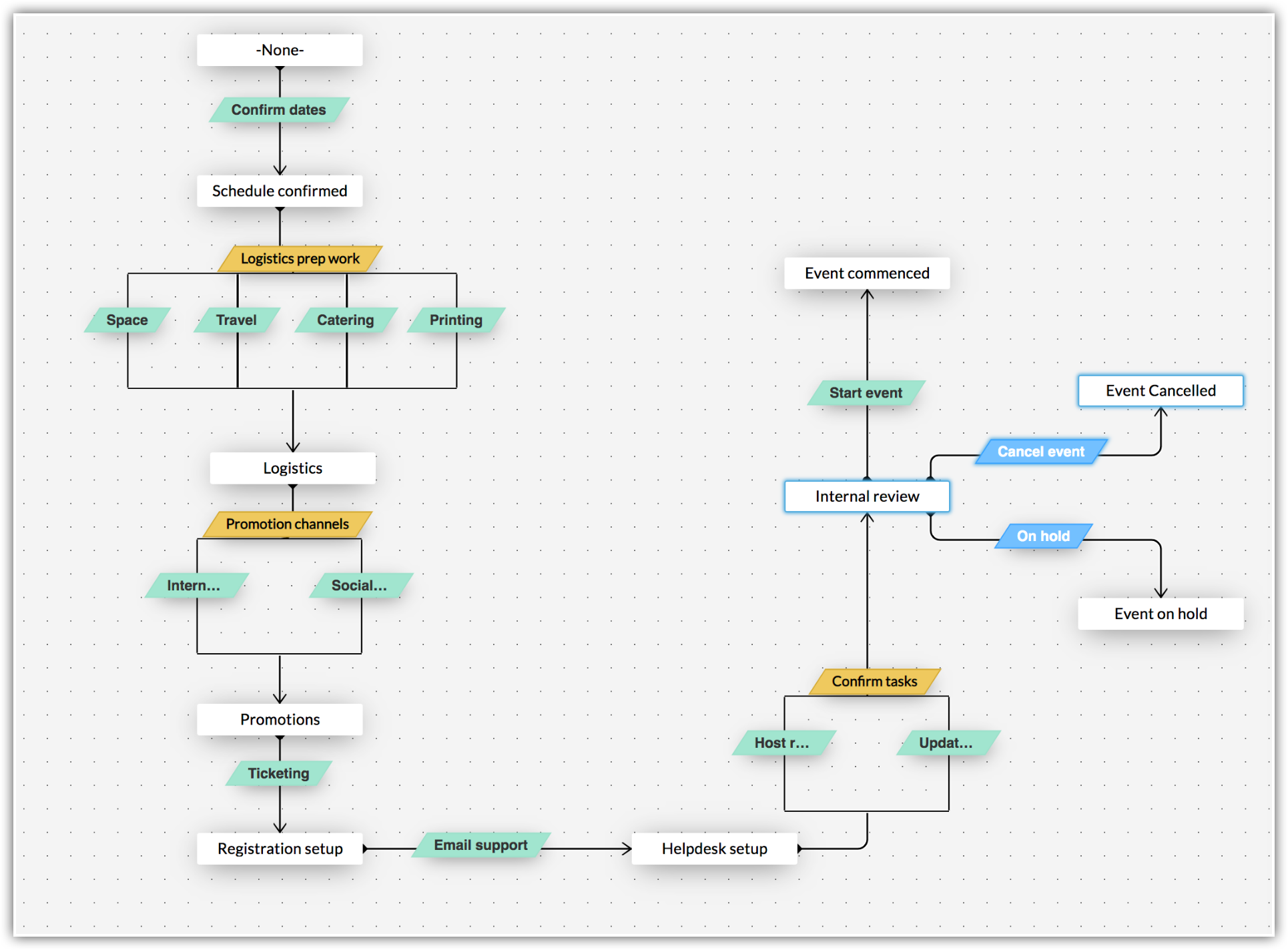このプロセスには、さまざまな「状態」があることが分かります。その中の[日時確定済み]の状態から[事前準備済み]の状態に進むには、物の準備や人の手配など、さまざまな作業を完了する必要があります。具体的には、使用物品の手配、会場の予約、Webサイトの作成、ケータリングの手配、登壇者の調整などです。これらすべての作業を完了することで、「遷移」の処理が完了し、次の状態に進むことができます。