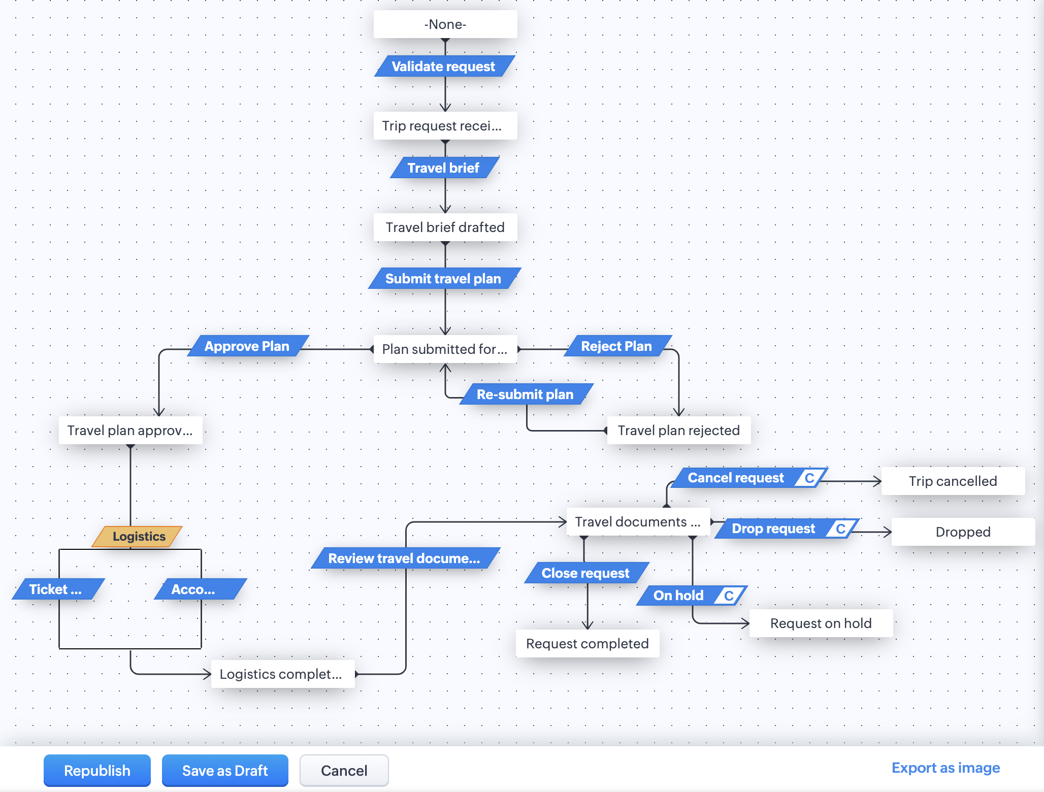 ジャーニー設計によって自動で作成された旅行申し込みデータに対して、ブループリントを適用します。社内で必要な業務を手順どおりに実行していくことが可能です(例:要件の確認、旅行プランの作成、上司による承認、チケット/宿泊先の手配、旅行書類のレビューなど)。 |