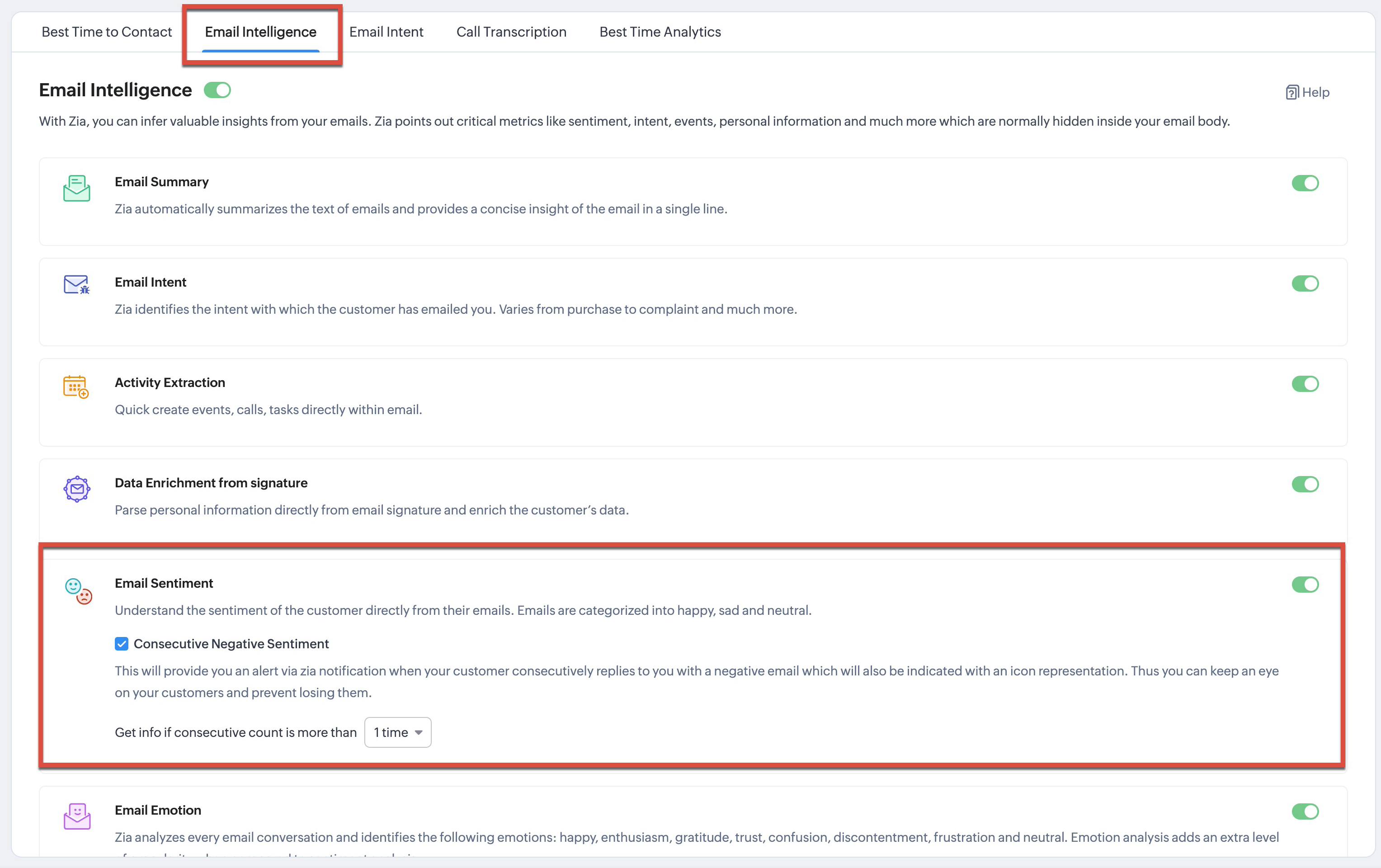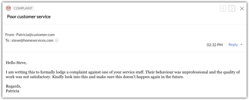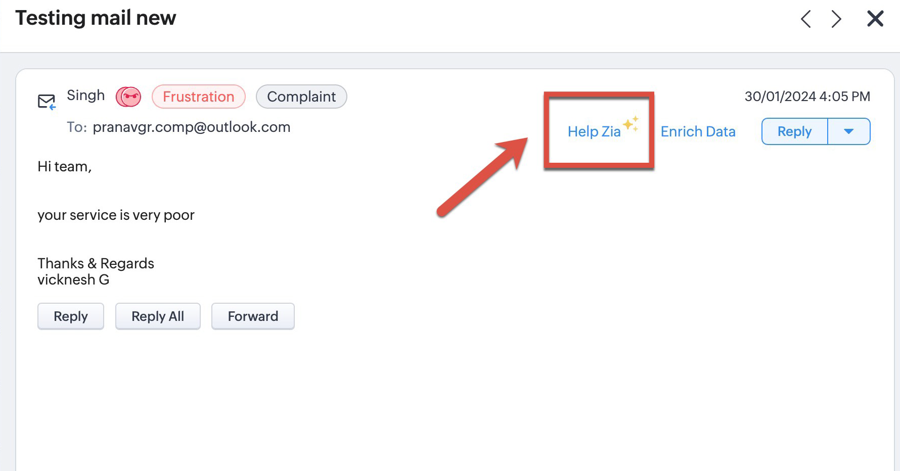 Ziaは、メールのやりとりをもとに、受信したメールの意図や目的を強調表示します。メールの内容がZiaによって解析され、依頼、質問、苦情、その他など、意図の種類が識別されます。