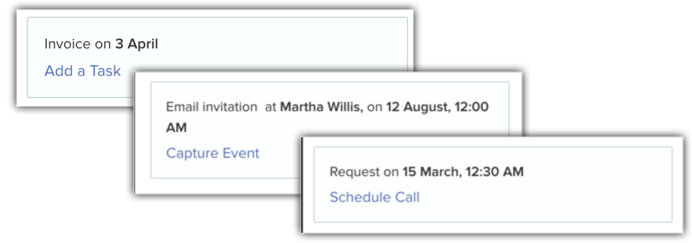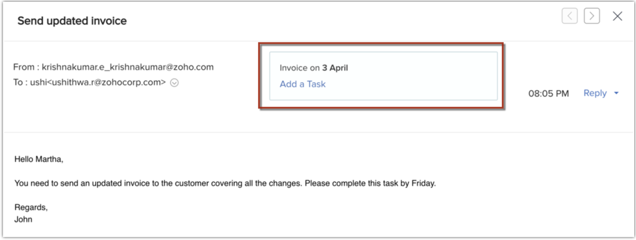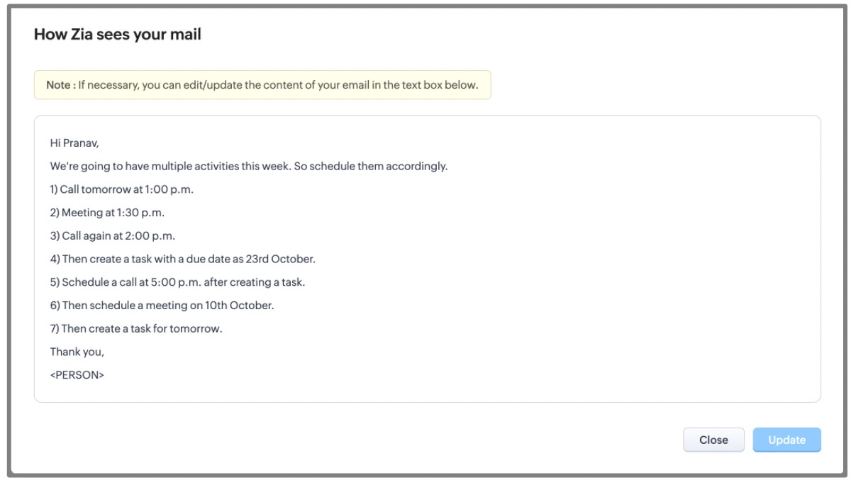 メールに記載されている活動に関する情報がZiaによって抽出されると、メールからZoho CRMに活動データを追加するよう提案されます。提案された活動データは、そのまま保存するか、必要に応じて内容を編集してから保存できます。Ziaによる提案内容は、データの[メール]関連リストまたは[シグナル]の欄に表示されます。