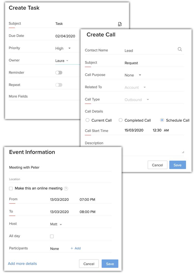 業務上の連絡には、多くの場合、メールが使用されます。メールは、連絡手段としてだけではなく、情報の保管場所としても重要な役割を果たします。メールで調整した打ち合わせ日程などの予定、業務上の依頼や対応事項などのタスク、顧客の住所や電話番号などの連絡先情報など、さまざまな情報がメールに保管されます。これらの情報をメールからZoho CRMに手作業で入力するには手間がかかります。
