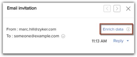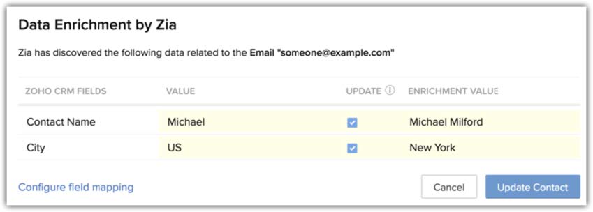 - Zoho CRMアカウントでZiaによるデータ補完機能を有効にしている場合、インターネット上の公開情報が取得されて自動で表示されます。必要に応じて、メールの署名から取得した情報で、これらの項目の値を上書きできます。[更新する]列で対象項目のチェックボックスを選択することで、項目値を上書きするように設定できます。