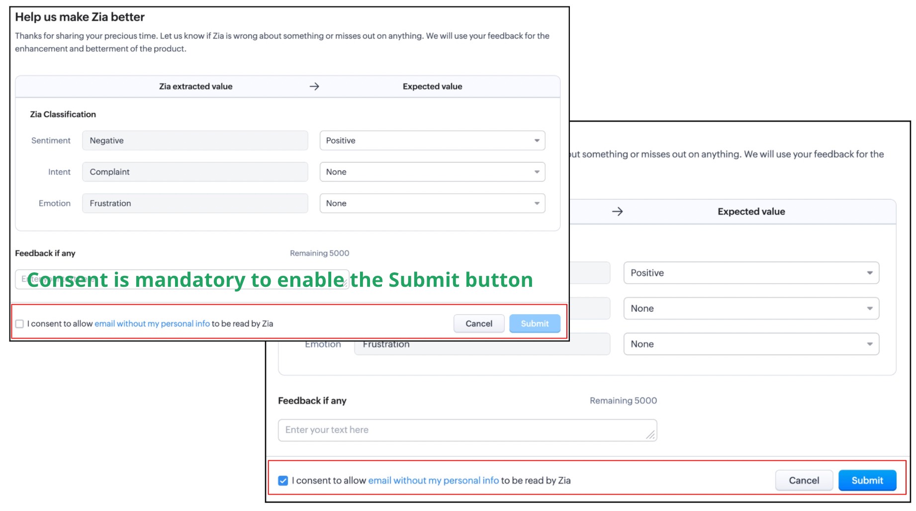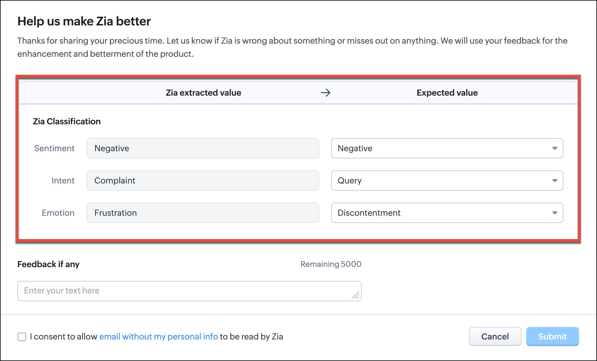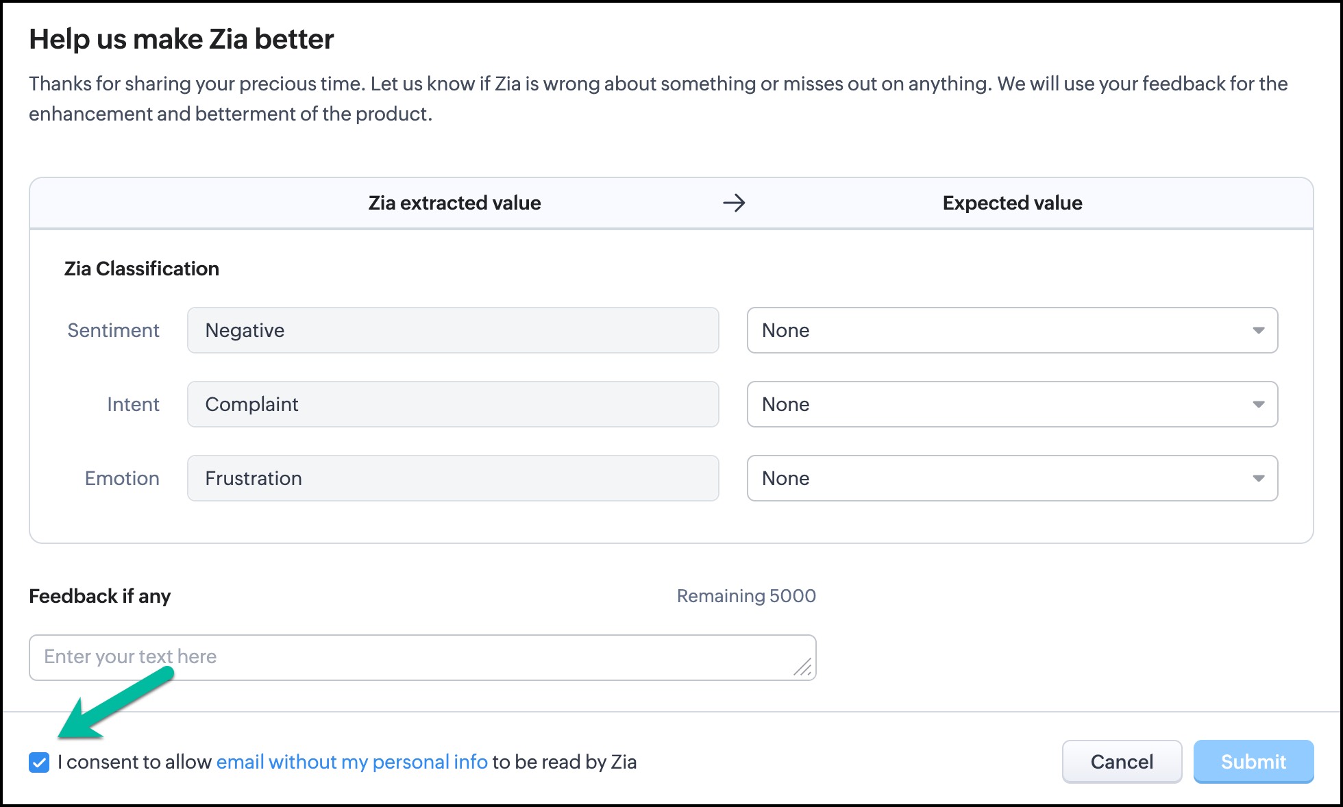 - 送信されたすべてのフィードバックは、担当者による確認後、Ziaの学習に使用されます。