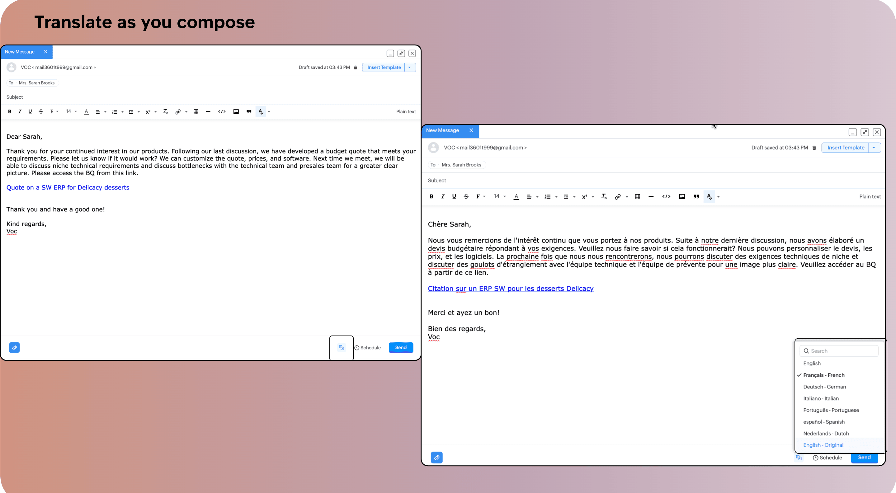 世界中に拠点を置いていたり、海外の顧客に対応したりする場合、それぞれの地域の言語で顧客に対応する必要があります。しかし、母国語以外の言語で対応を進めるのは大変です。このような場合に、Ziaのメールの翻訳機能が役立ちます。