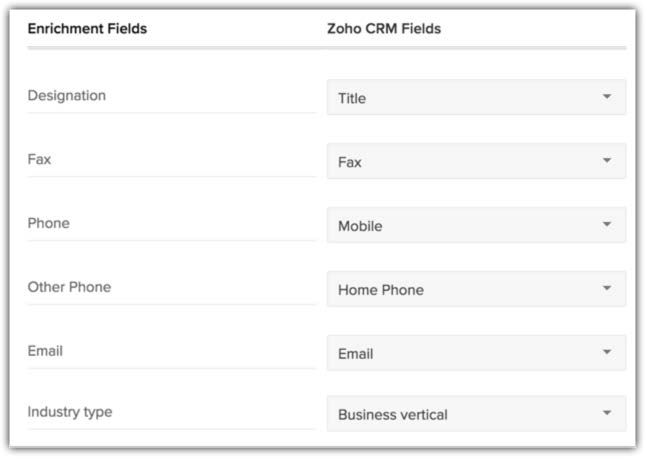 データ補完の設定画面で、[Zoho CRMの項目]列のドロップダウンから関連付ける項目を選択します。