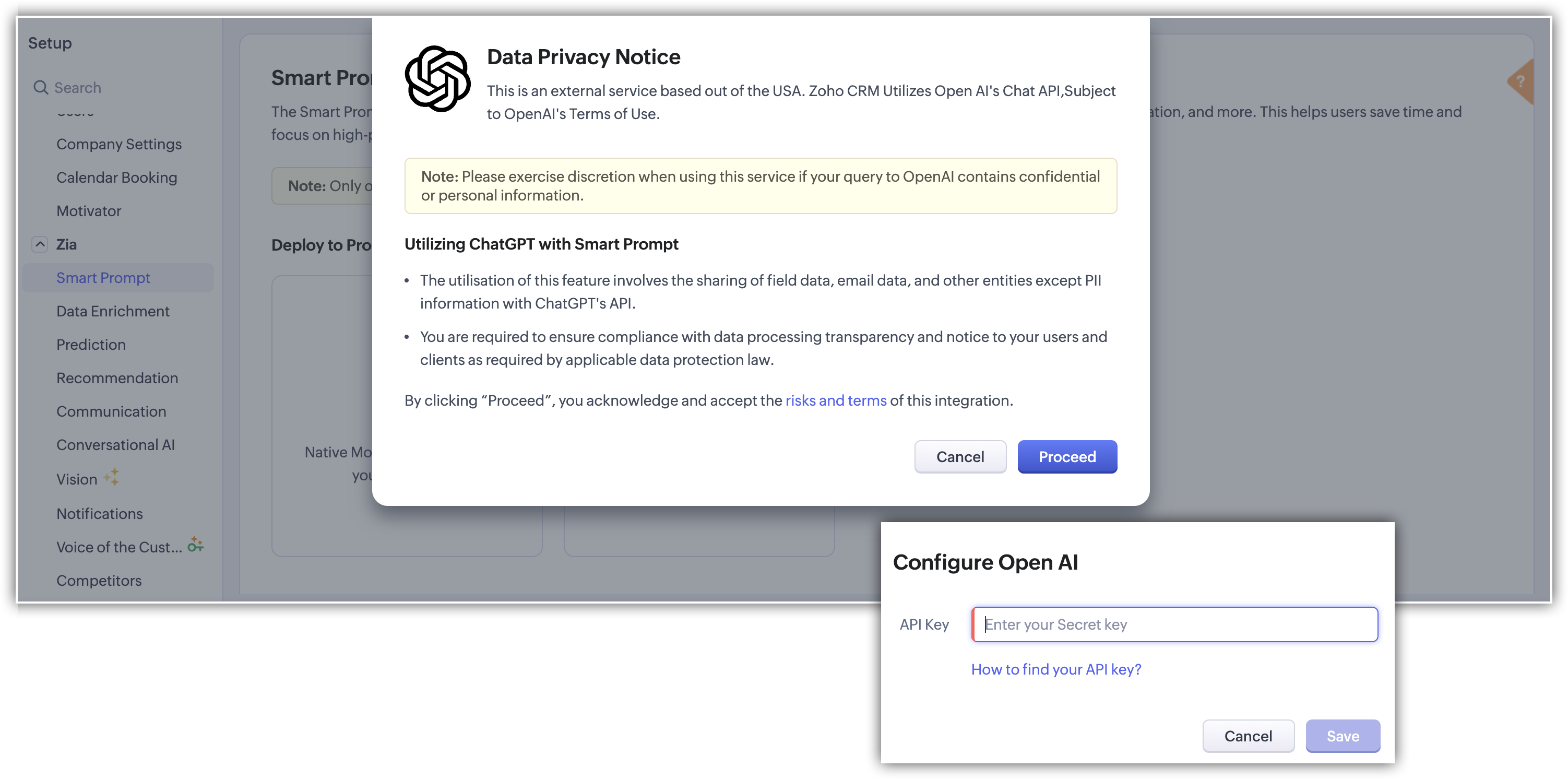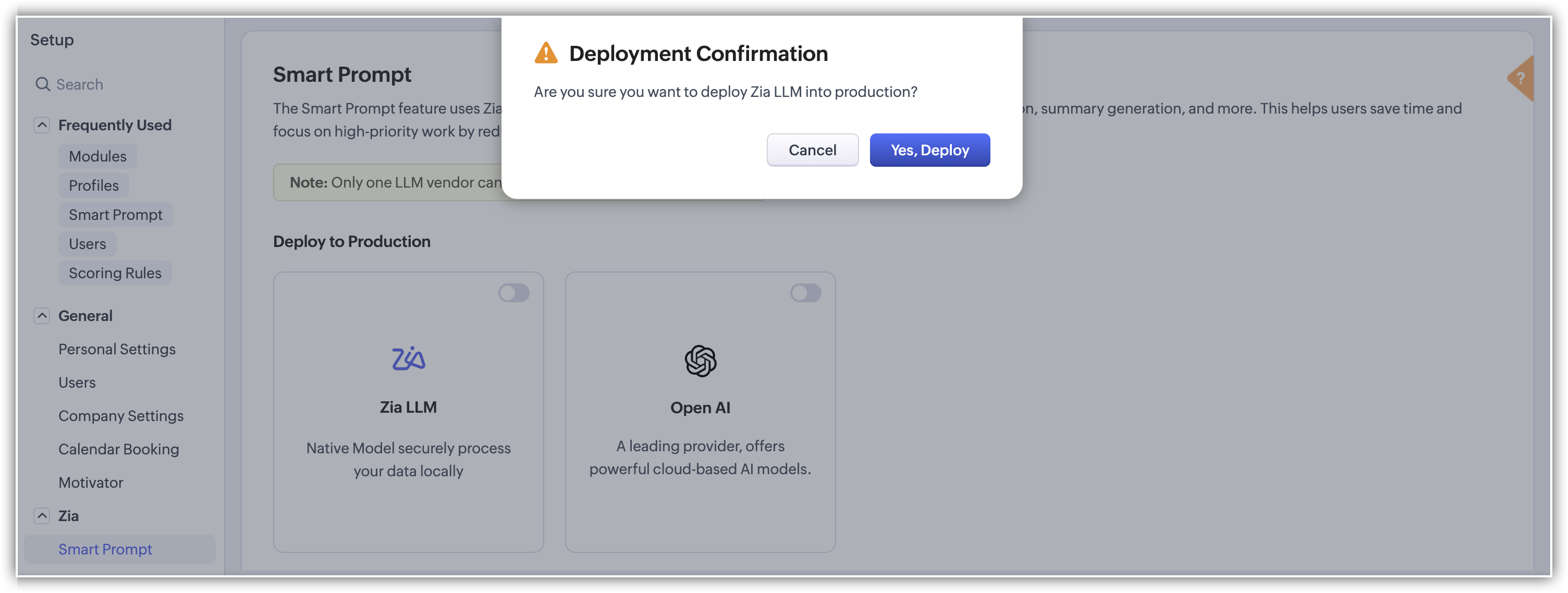 Zia:Zohoが開発したAIモデルです。Zoho CRMのデータを学習し、組織の文脈を踏まえた回答を生成します。Zoho内のみで動作するため、セキュリティを保護したい場合に最適です。ChatGPT:OpenAIが開発した生成AIのChatGPTでは、同社が収集、整理したデータをもとにした大規模言語モデルが利用されています。ChatGPTは、2021年までの学習データに基づき、人間のように自然な回答を生成します。幅広いデータに基づく一般的な回答を生成したい場合に最適です。Google:Googleが開発した生成AIのGeminiでは、大量の学習データに基づいて回答が生成されます。Googleサービスの各機能を通じて、顧客のデータを処理することが可能です。なお、回答を生成するにあたって、Zoho CRMに保存されているデータではなく、公開されている外部のデータが使用されます。Anthropic:Anthropicが開発したClaudeでは、提供したデータや公開されている外部のデータをともに学習が行われます。Zoho CRMに保存されているデータを活用しながら、外部のデータを参照して回答を安全に生成することが可能です。Cohere:Cohereが開発する、組織向けのAIモデルです。個人情報を完全に管理しながらデータの処理を行うことができます。大量のデータをもとに学習を行い、公開されている外部のデータを活用して回答を生成することが可能です。DeepSeek:オープンソースモデルを通じてデータの学習を行うことができます。費用対効果の高い運営を実現することが可能です。プライバシー保護に関する規制やポリシーに準拠してデータを収集し、回答を生成します。Zoho CRMに保存されているデータに関連しない指示やタスクを行うことができます。SiliconFlow:SiliconFlowが提供するAIプラットフォームです。さまざまな言語のデータをもとにモデルの学習が行われています。操作性が高く、データのプライバシー保護を安全に行うことができます。通常のWebアプリに加えて、モバイルアプリにも適しています。