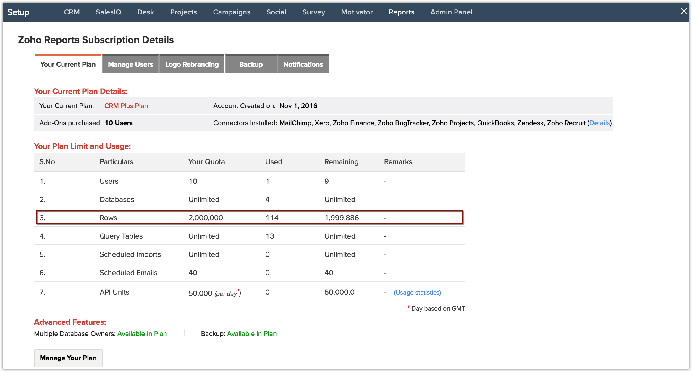 メモ:また、Zohoレポート サブスクリプション 詳細ページの通知タブを選択し、行使用通知を有効にして、行の使用量がしきい値を超えたときにメール通知を受け取ることができます。