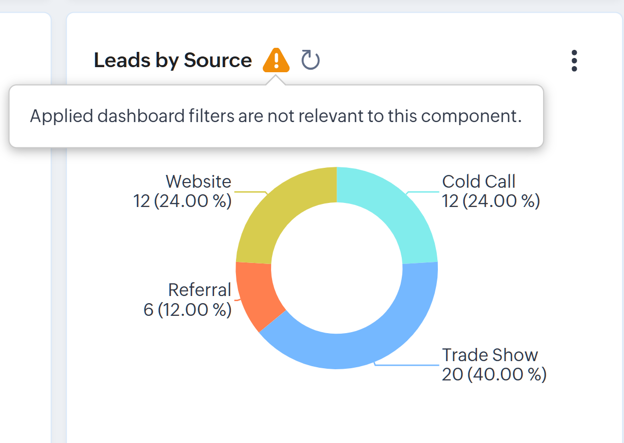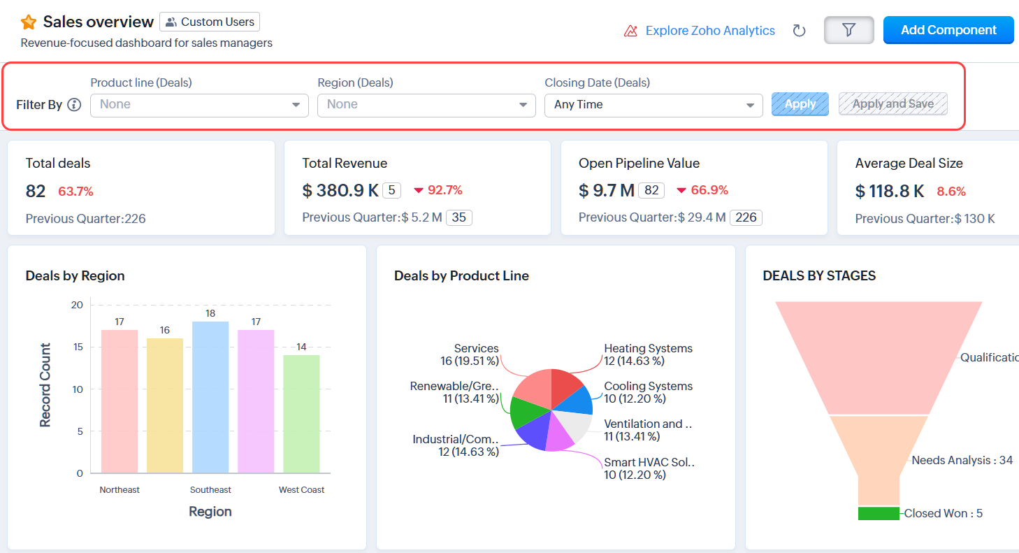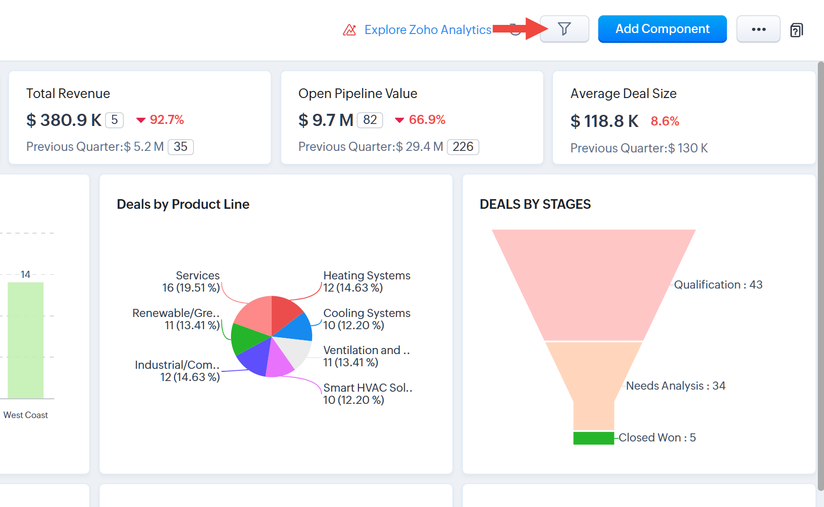 組織のZoho CRMアカウントに表示されるダッシュボードは、次のように分類されて表示されます。