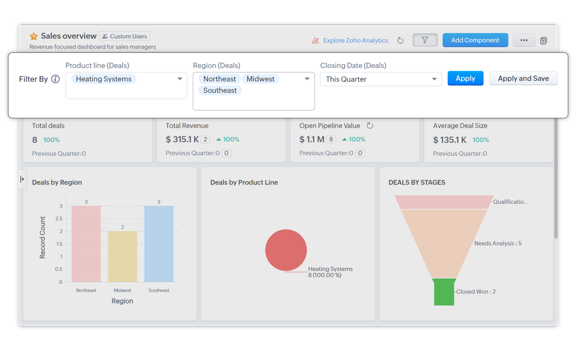 Zoho CRMには、標準のダッシュボードがあらかじめ用意されていて、一般的によく使われる表/グラフをすぐに確認できます(例: 商談のステージ別の進捗状況、取引先別の売上、キャンペーンと売上)。