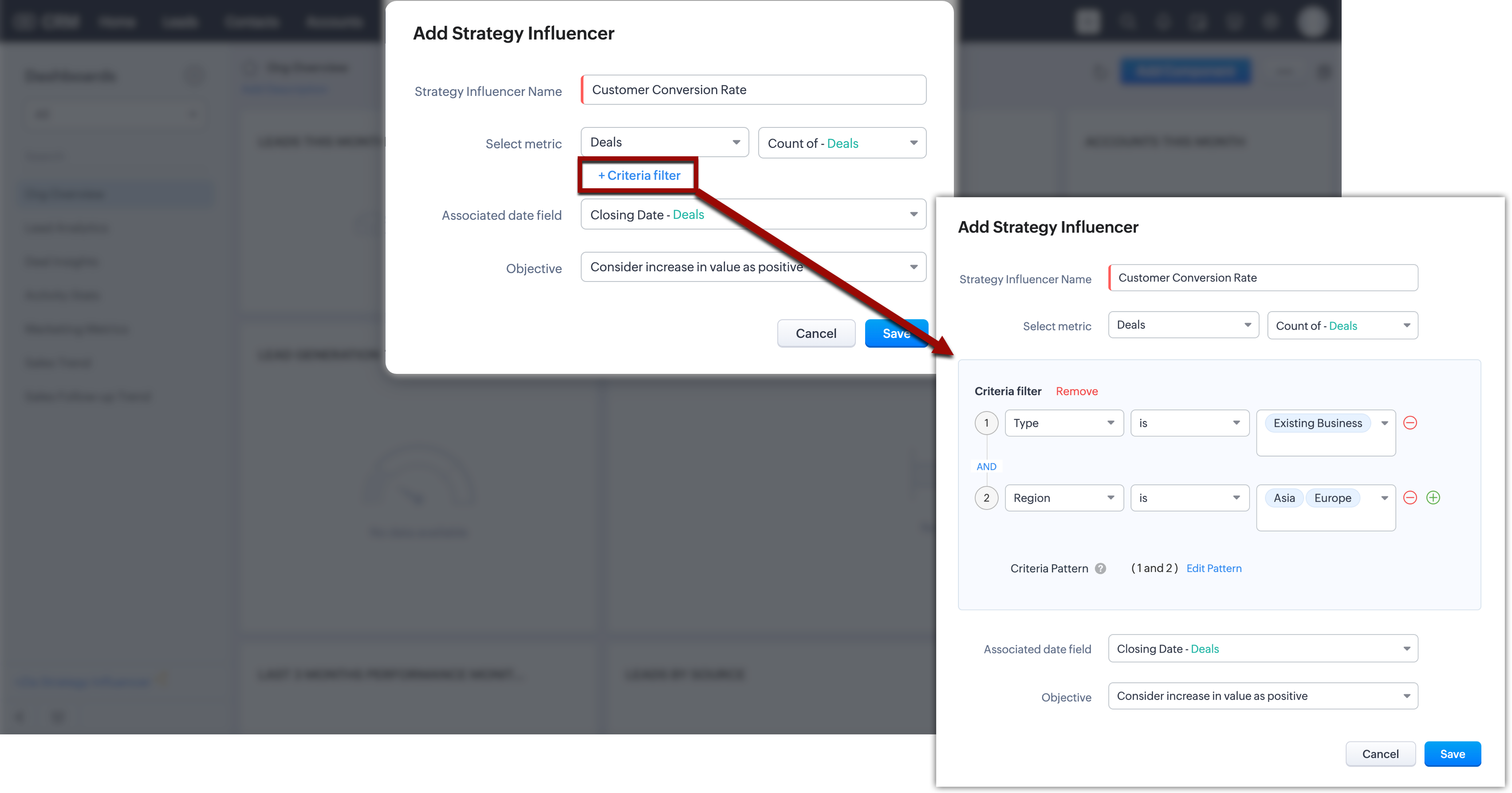 - 目標達成要因分析をさらに設定したい場合は、support@zohocrm.comにお問い合わせください。