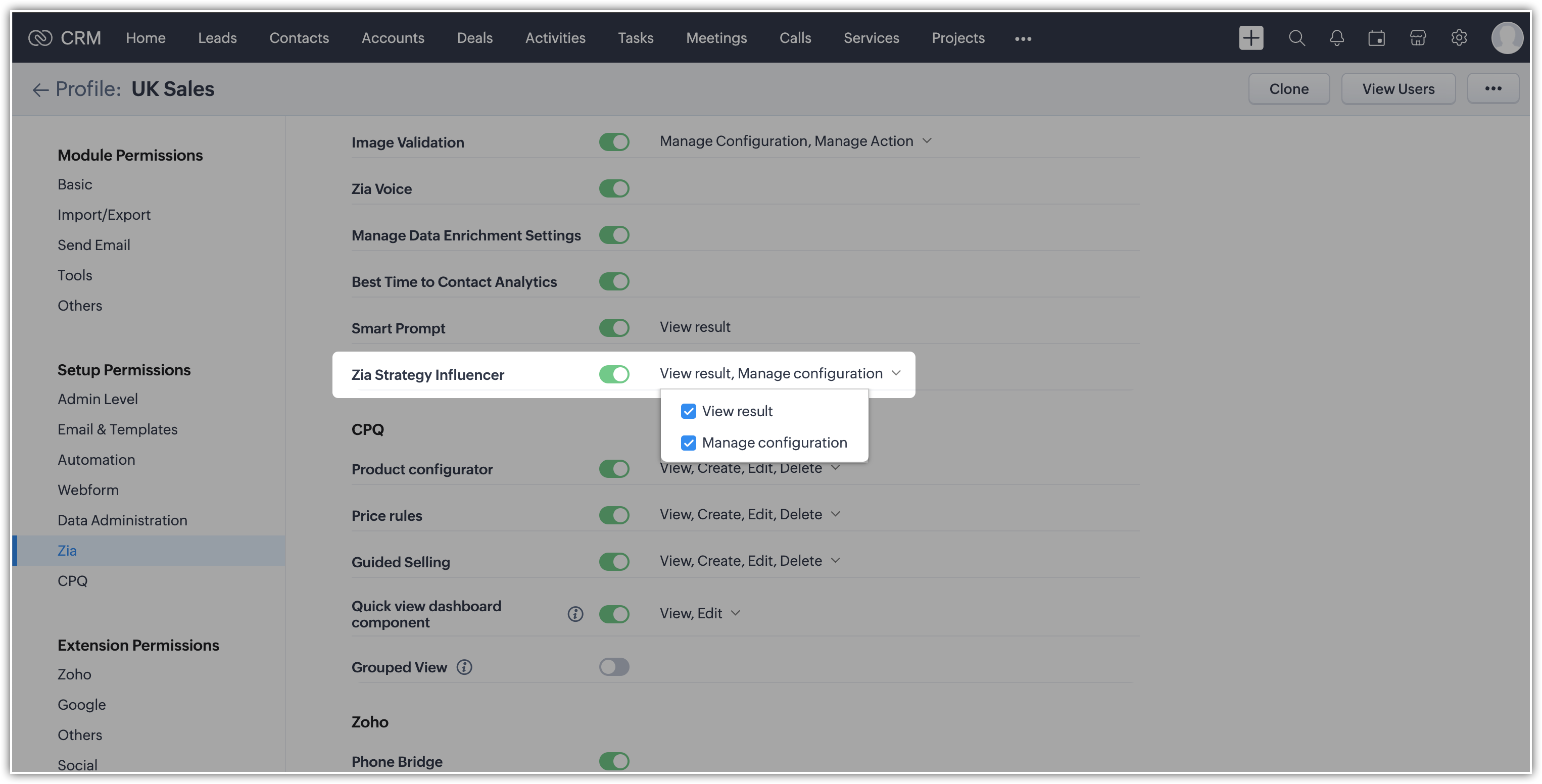 - 管理者権限(Zia目標達成要因分析に関する[設定の管理]の権限があるアカウント)でZoho CRMにログインします。