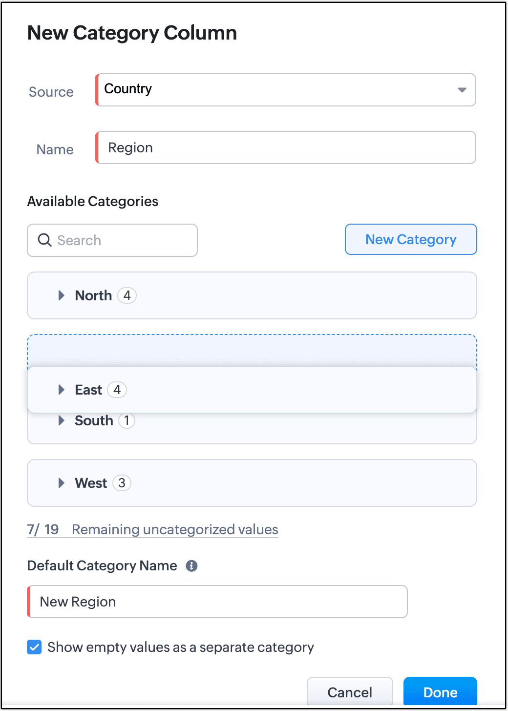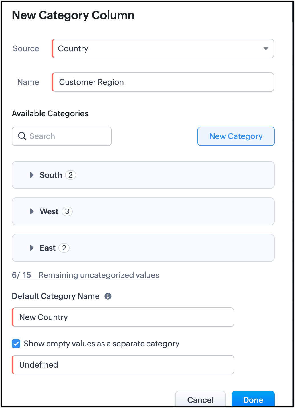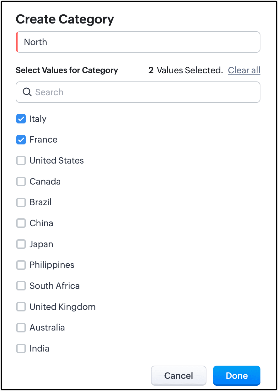 - 各カテゴリーについて、カテゴリー名を入力し、値を選択します。その後、[完了する]をクリックします。この例では、[南部]、[東部]、[西部]という3つのカテゴリーを追加し、それぞれに該当する国を選択します。