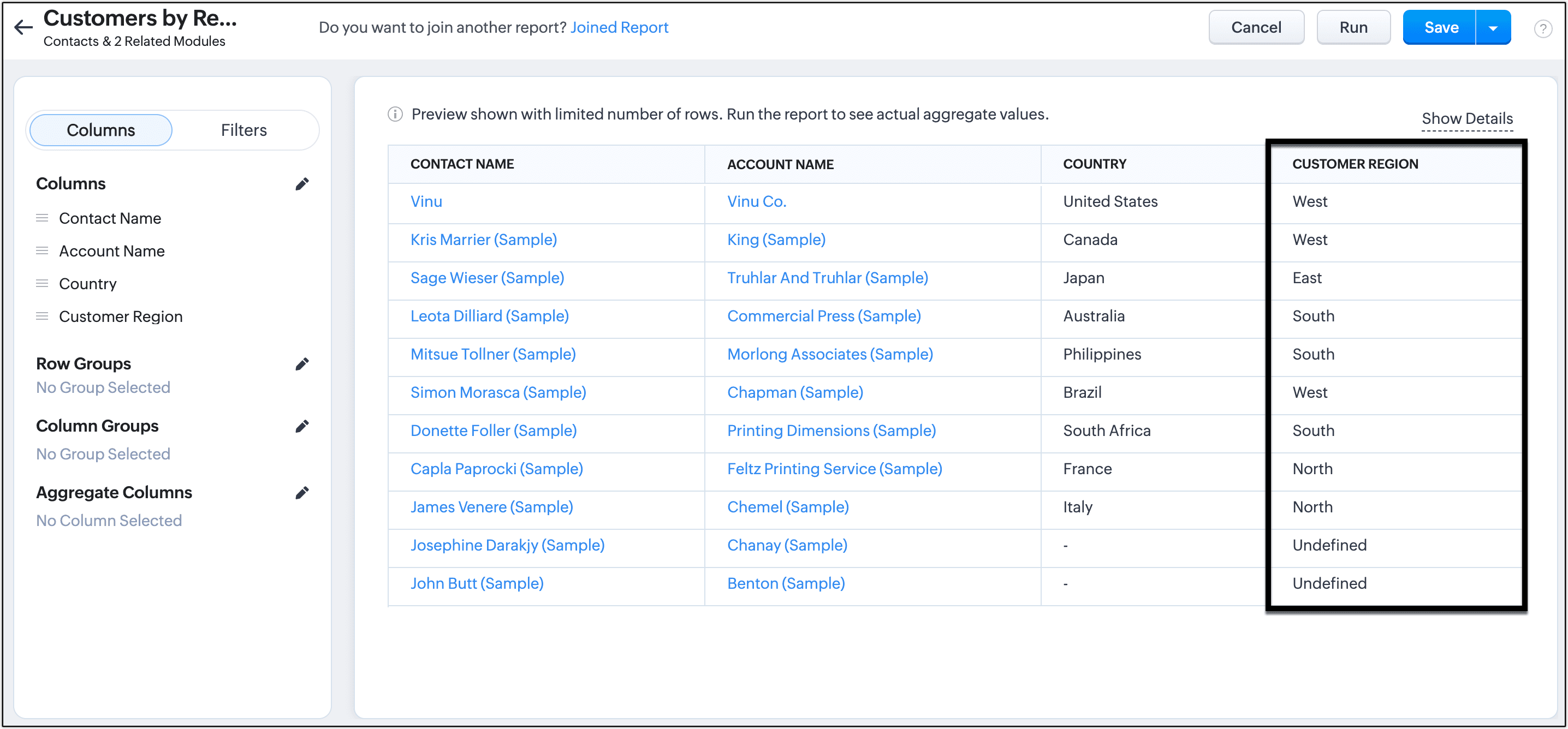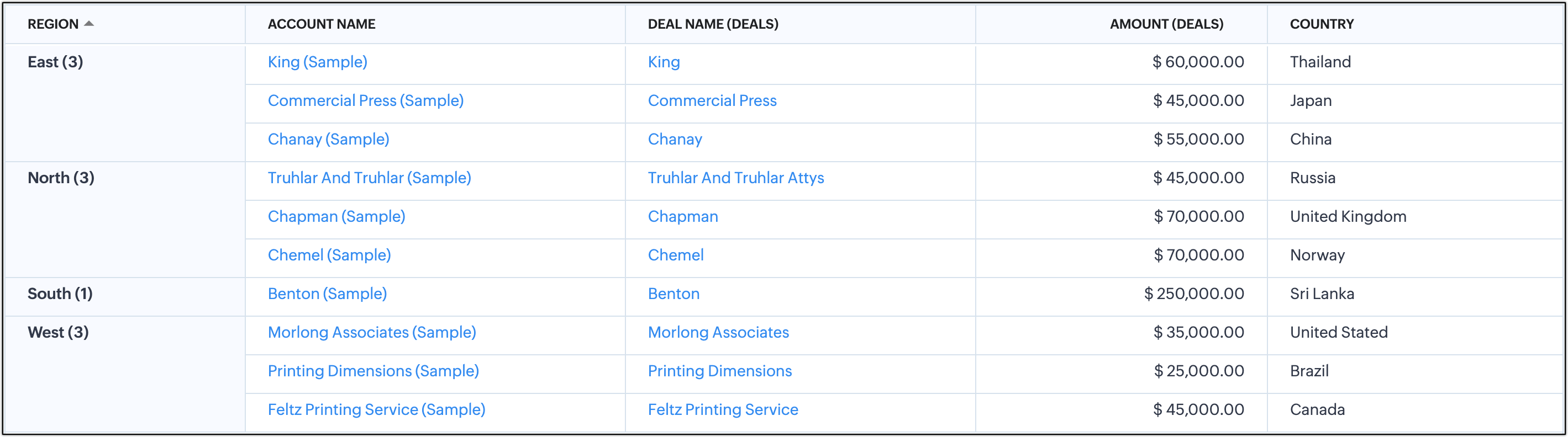 ある営業マネージャーが、顧客の国別に営業戦略を策定するため、業績レポートを分析しています。営業マネージャーは、このレポートから、地域ごとに顧客の購買行動にどのような特徴があるのかを知りたいと思っています。レポートには、取引先名、商談名、金額、国などの詳細が含まれます。