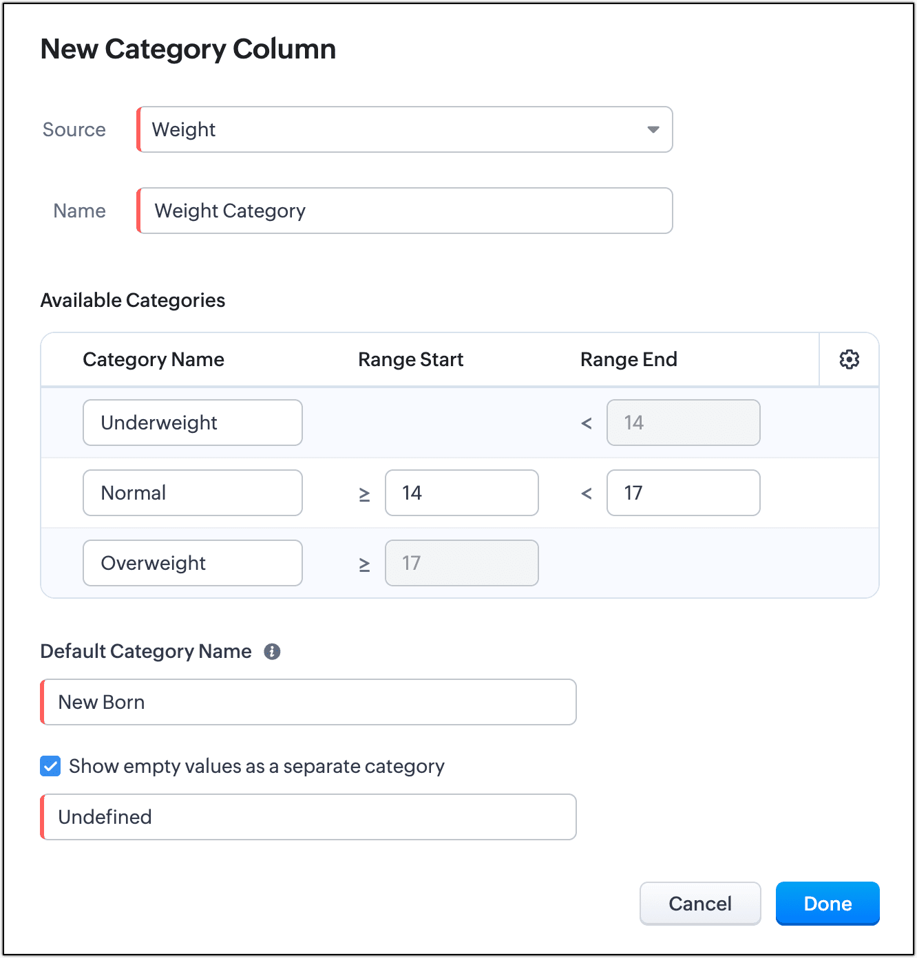 - それぞれのカテゴリーについて、名前と、範囲の開始値および終了値を入力します。このとき、開始値と終了値は、各範囲の値が適切な順序で連続するように指定してください。新しいカテゴリーを追加するには、緑色の[+]アイコンをクリックします。