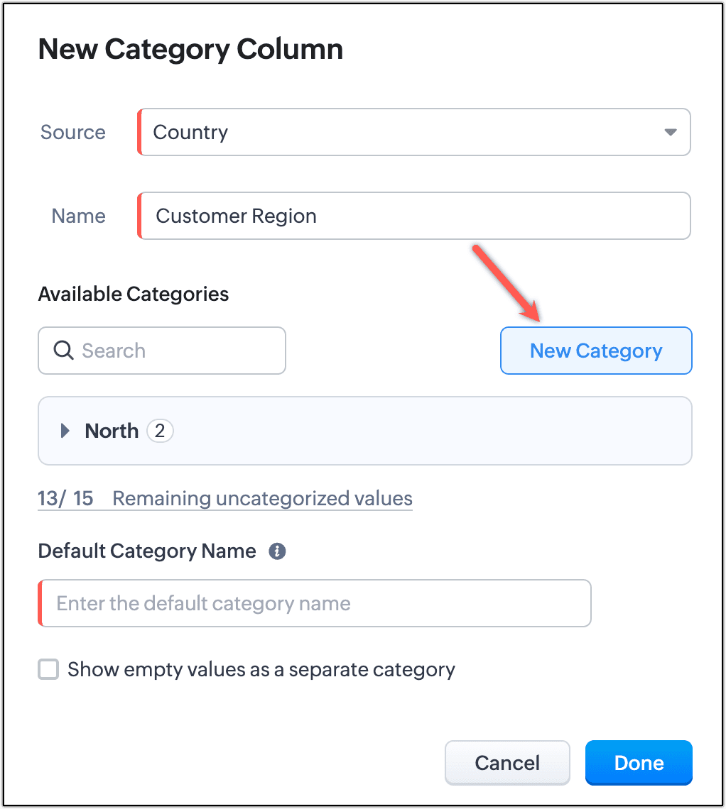 - カテゴリー名を入力し、そのカテゴリーに分類する値を選択します。その後、[完了する]をクリックします。この例では、最初のカテゴリーとして[北部]を作成し、北部に該当する国を選択します。