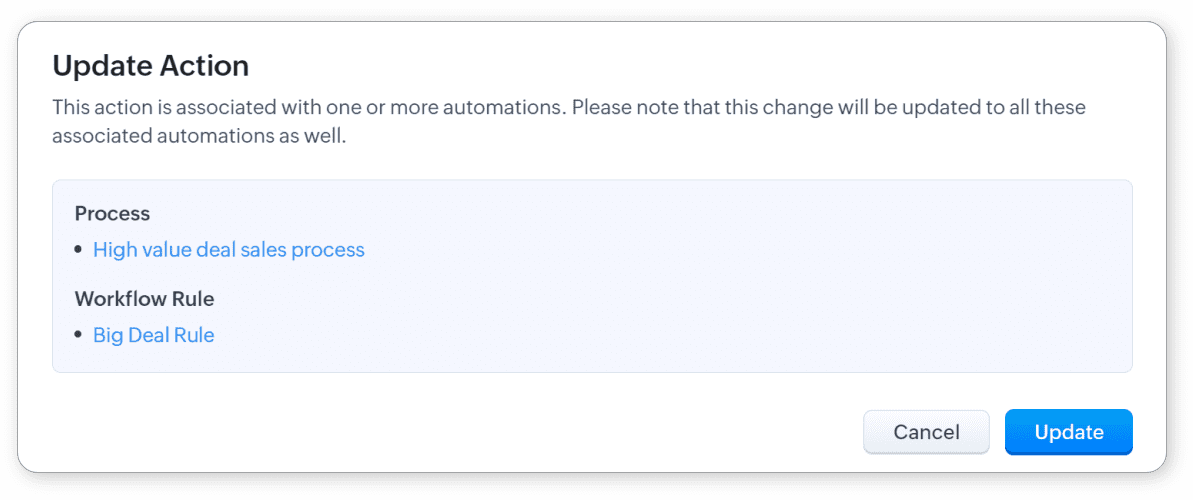 処理は、タブごとに設定する必要があります。あるタブに対して作成した自動化設定(ワークフロールール/承認プロセス/ブループリント)に関連付け可能な処理は、同じタブに対して作成した処理のみです。作成した処理は、関連付けられている自動化設定に応じて実行されます。たとえば、承認プロセスにおいてメール通知の送信の処理を関連付けることで、データが編集/作成された際に、マネージャーにメールで通知するように設定できます。同様に、ブループリントに処理を関連付けることで、商談のステージが進んだ際に、担当者にタスクを割り当てるように設定できます。また、ワークフロールールに関連付けた処理を、すぐに実行するか、特定の日時に実行するかを選択することも可能です。