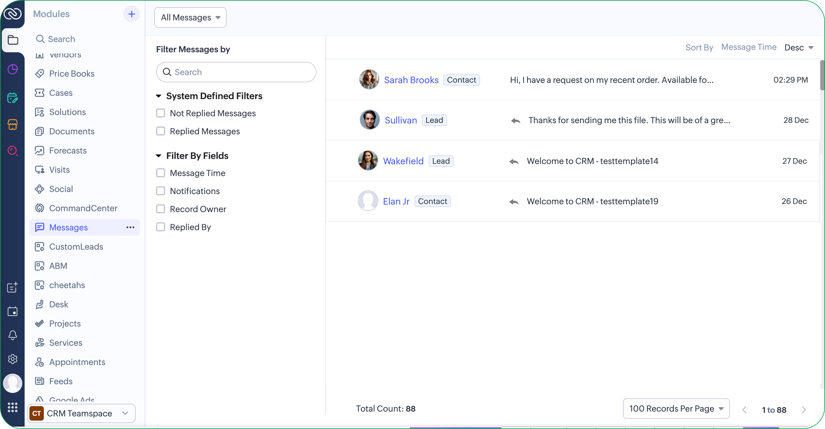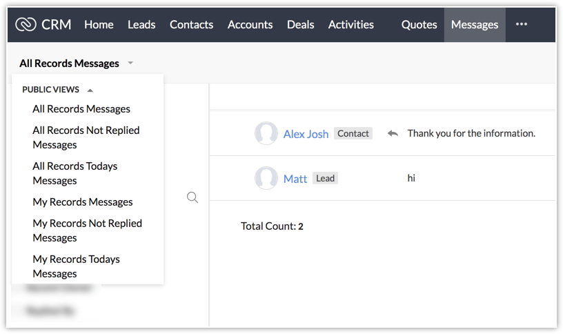 WhatsAppでのチャット(メッセージのやりとり)の開始は、見込み客や連絡先として登録されている人からのみ可能です(Zoho CRMのユーザーから開始することはできません)。見込み客や連絡先から受信した新しいメッセージ、既存のやりとりでの返信メッセージは、