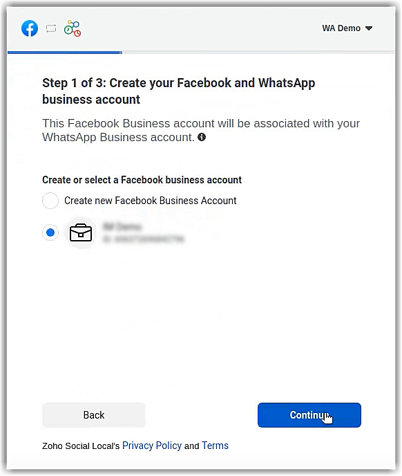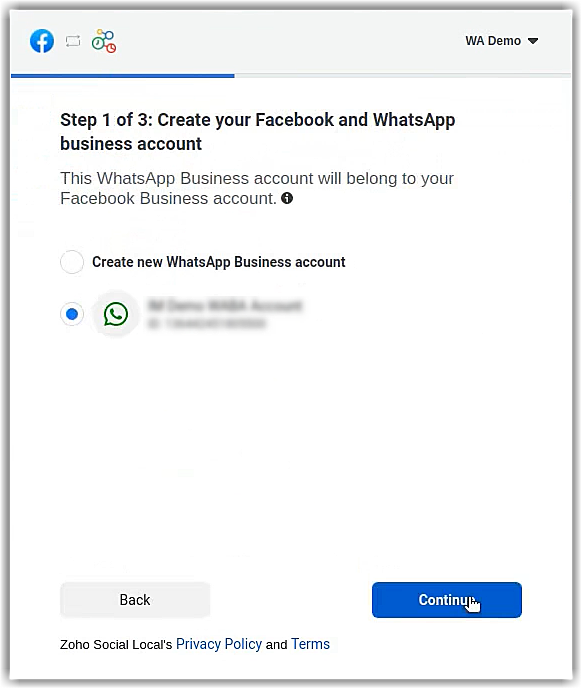 - 連携するWhatsApp Businessアカウントを選択します。新しいアカウントを作成することも可能です。