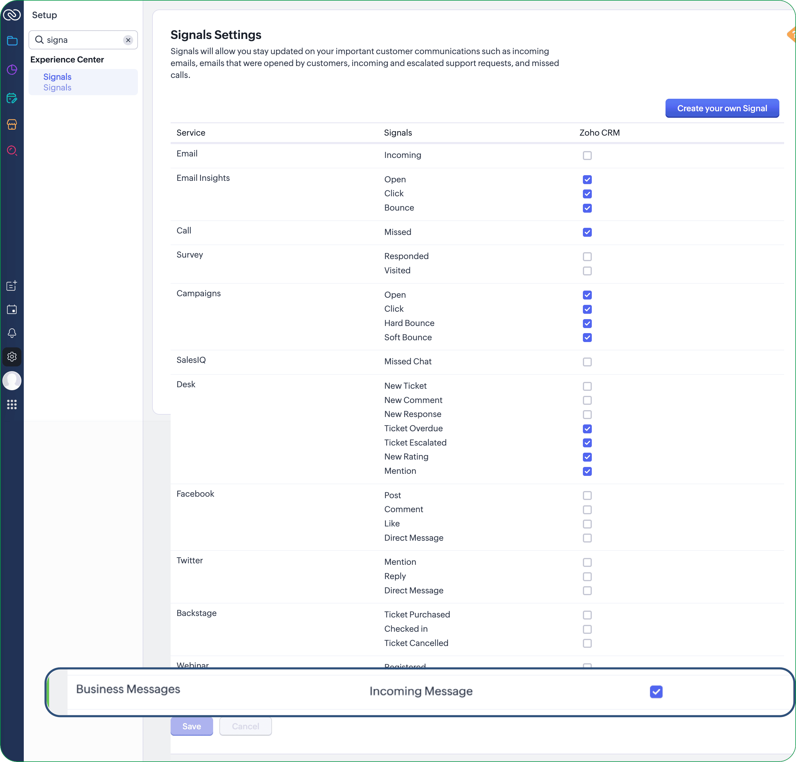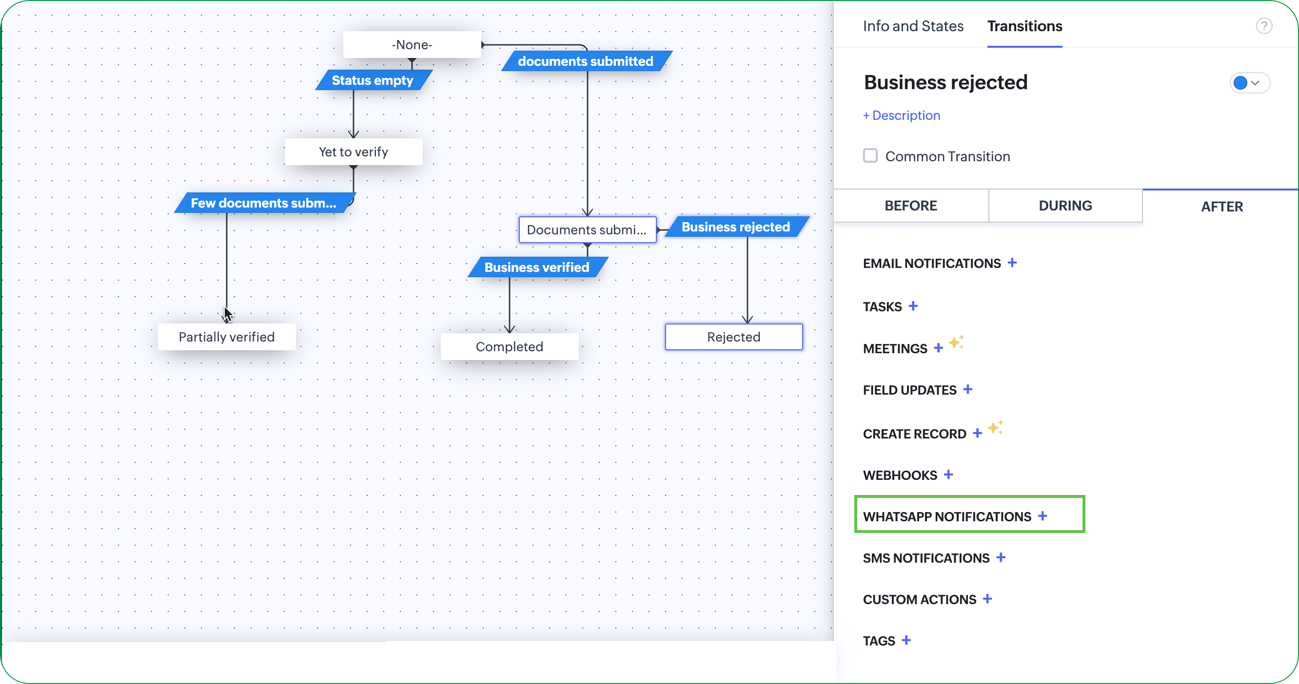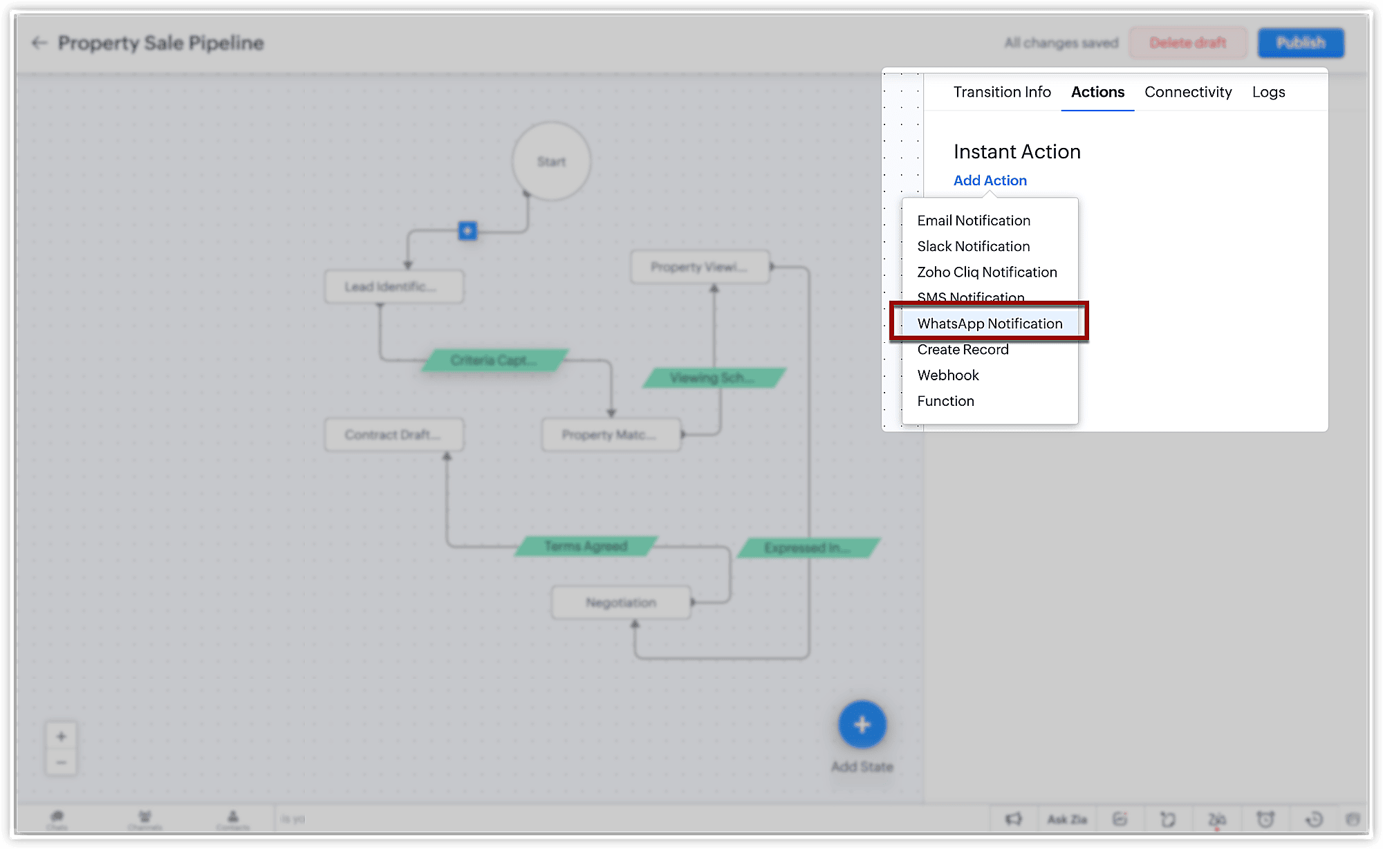 通知を有効にすると、WhatsAppで見込み客や連絡先からメッセージを受信するたびに、Zoho CRMで通知を受け取ることができます。