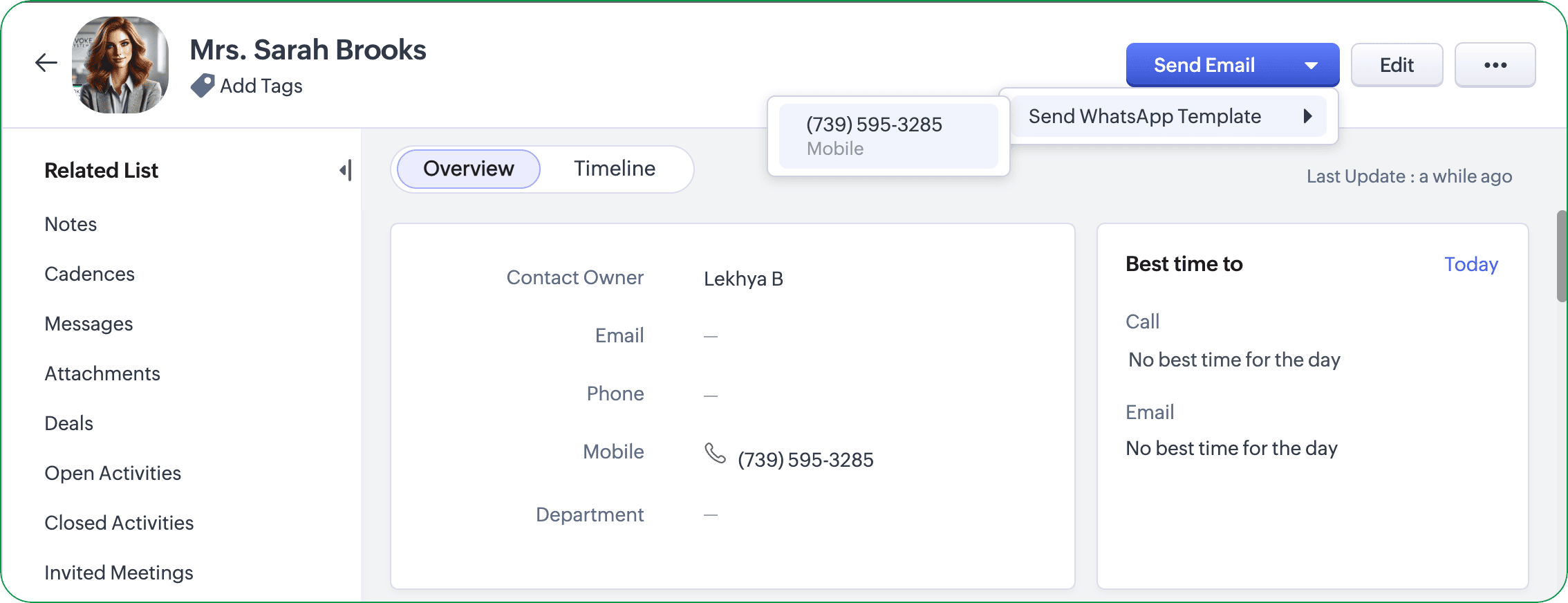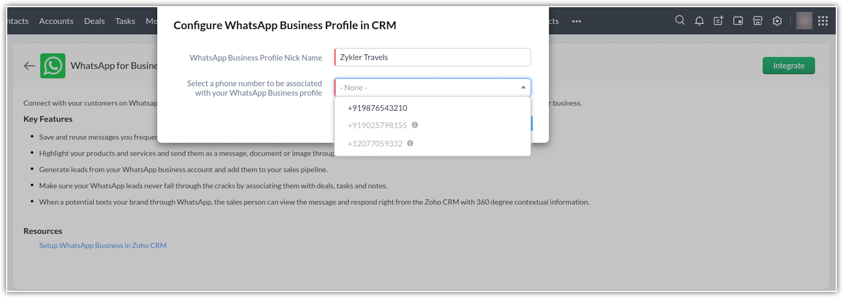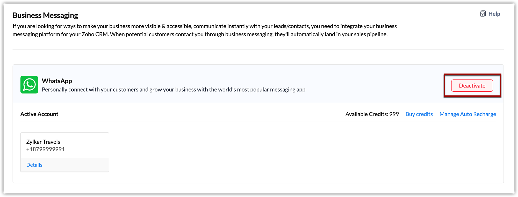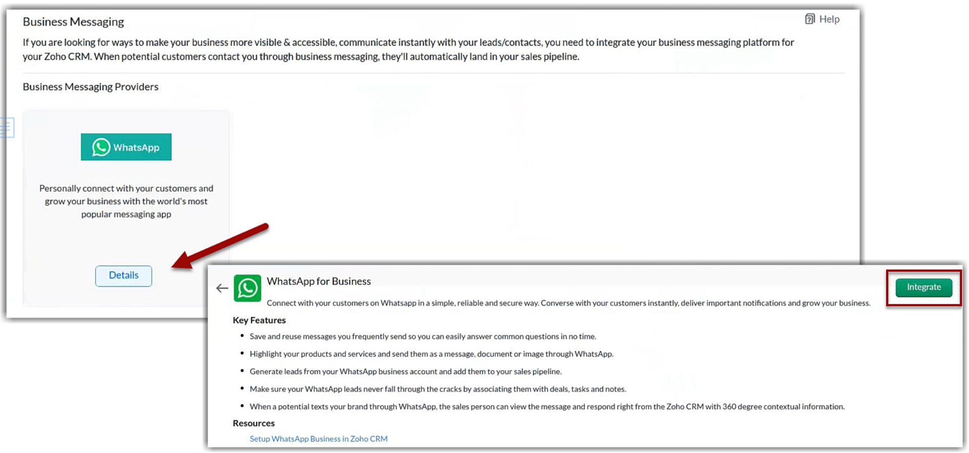 WhatsApp BusinessとZoho CRMとの連携の完了後、見込み客や連絡先とのメッセージのやりとりを開始できます。